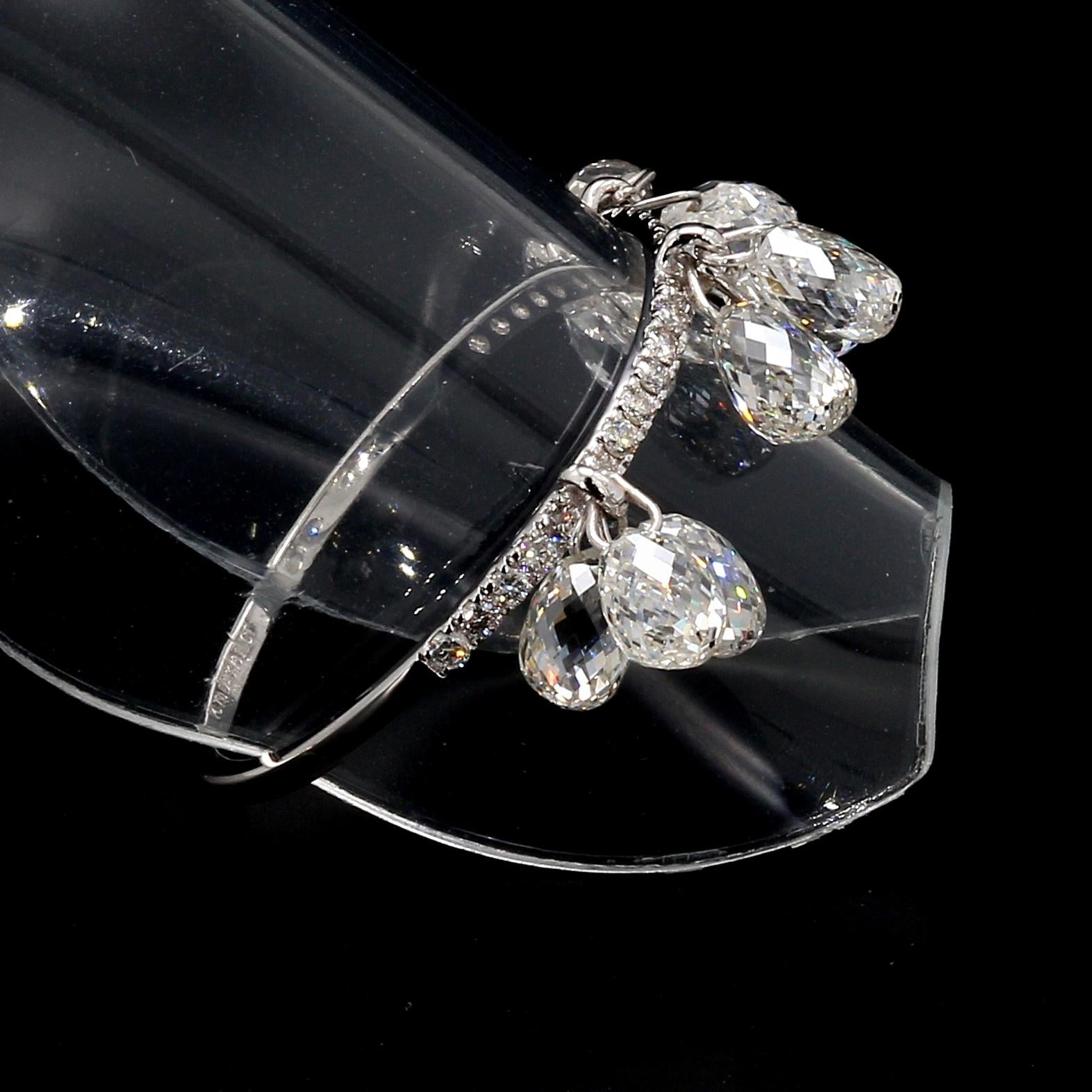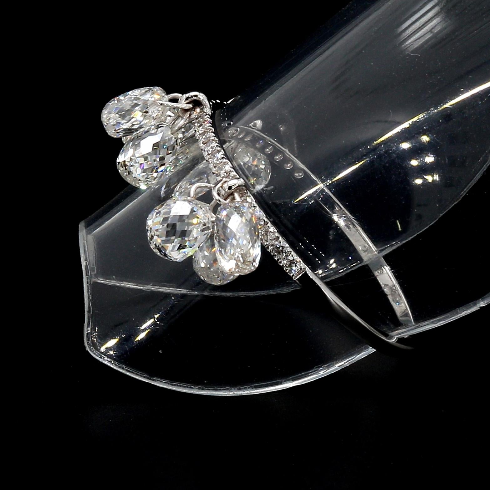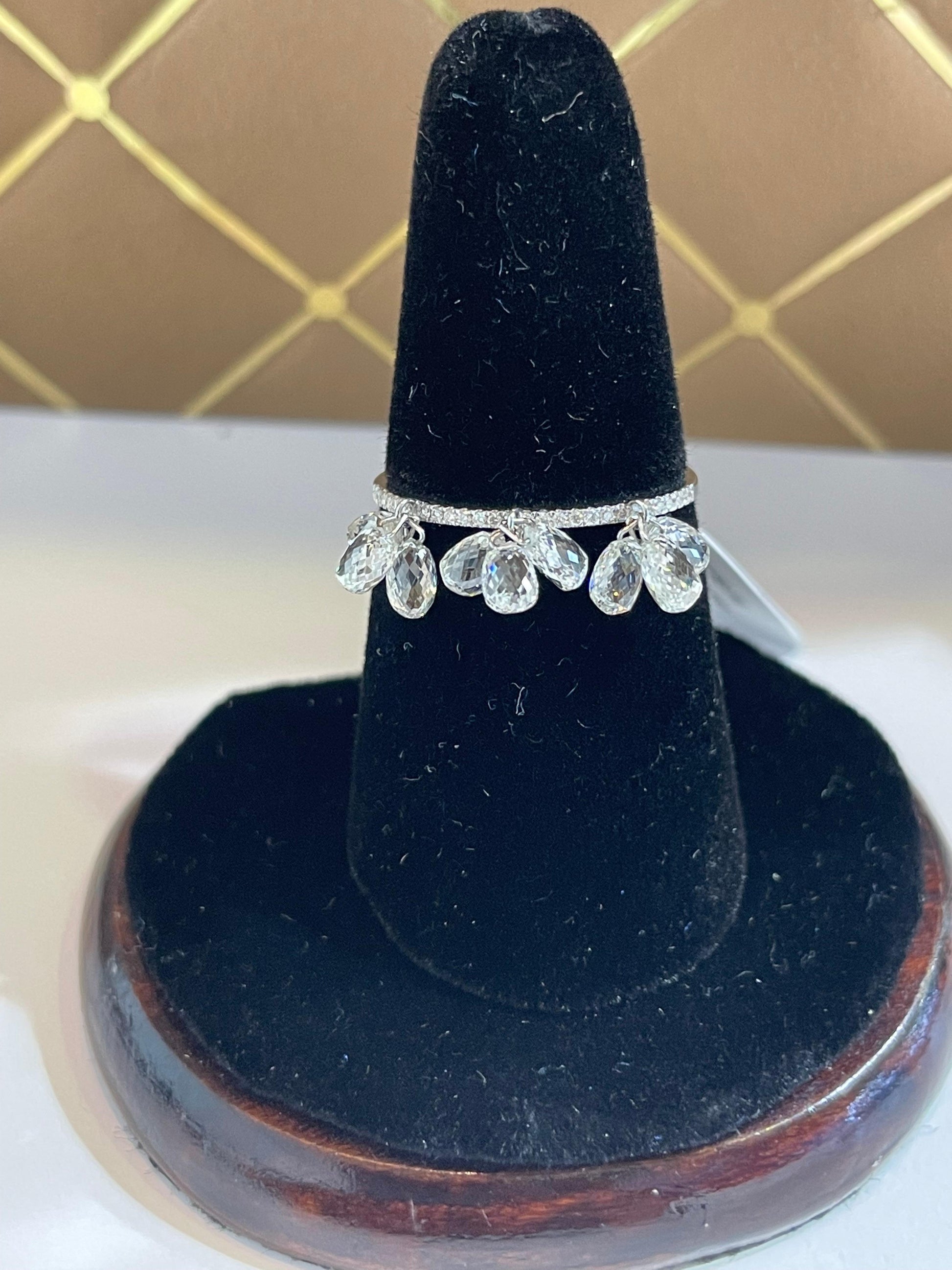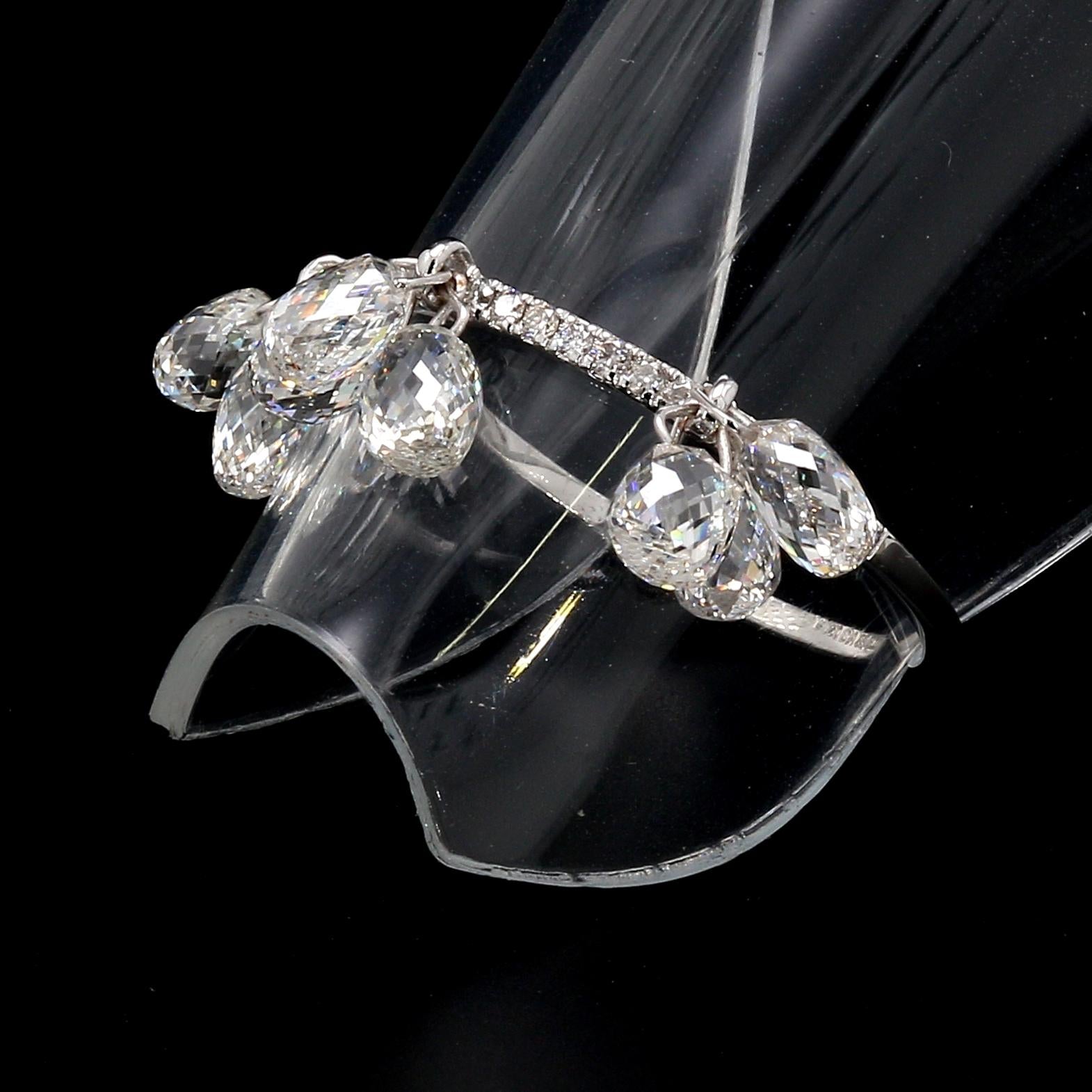 Inspired by the beauty of a rain drop, Our Briolette Dangling diamond ring is an absolute show-stopper. It has 9 pieces of White Diamond Briolettes with diamond band having smaller round brilliants. These rings can be stacked upto 4 rings or more and can be made to look like huge cluster of Diamond Briolettes dangling and shining from everywhere