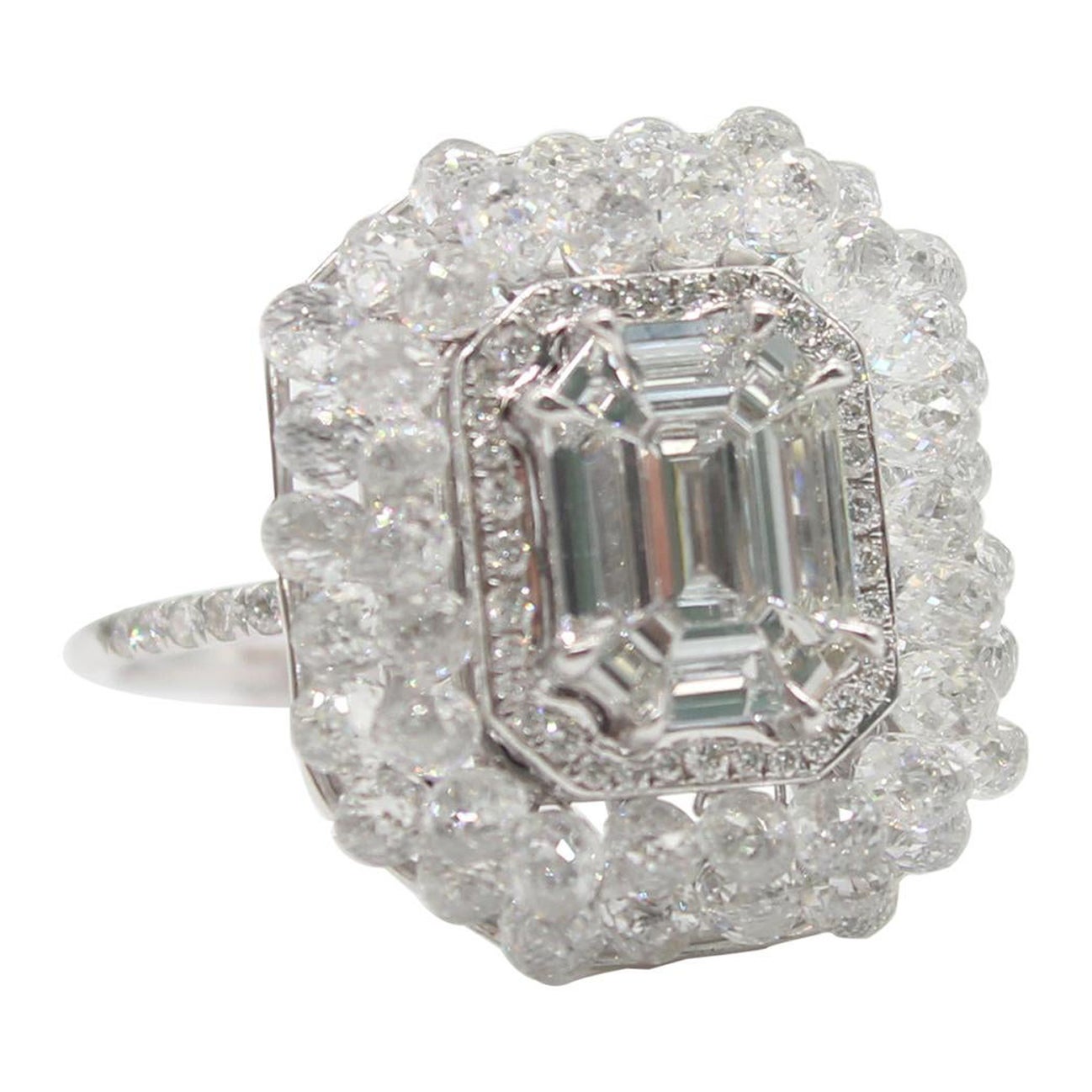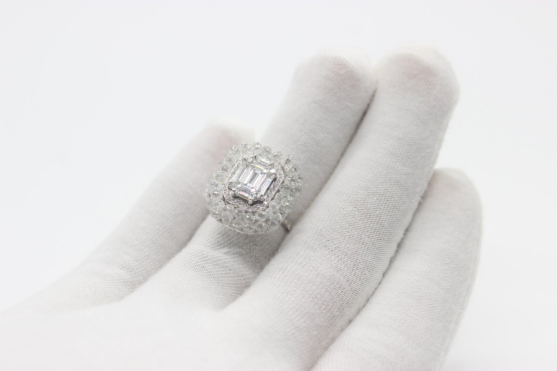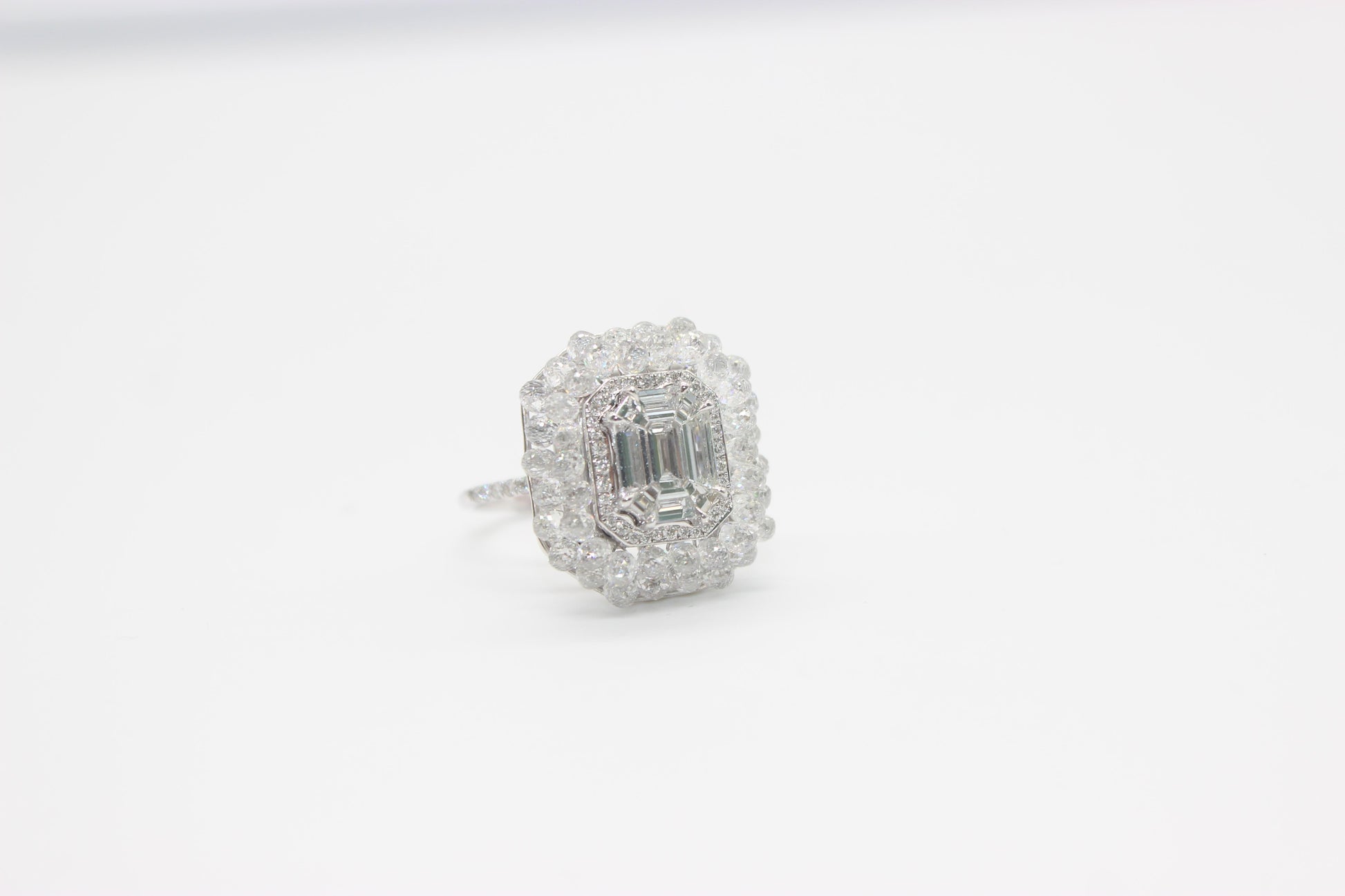 This massive diamond statement ring sparkles tremendously! This Panim distinctive clustered design completely covers the finger in icy white brilliance, and the striking, white gold setting gives it a one-of-a-kind appearance. It's impossible to miss this stunning ring. The ring features an illusion diamond at the center & 2 layers of diamond briolettes.
