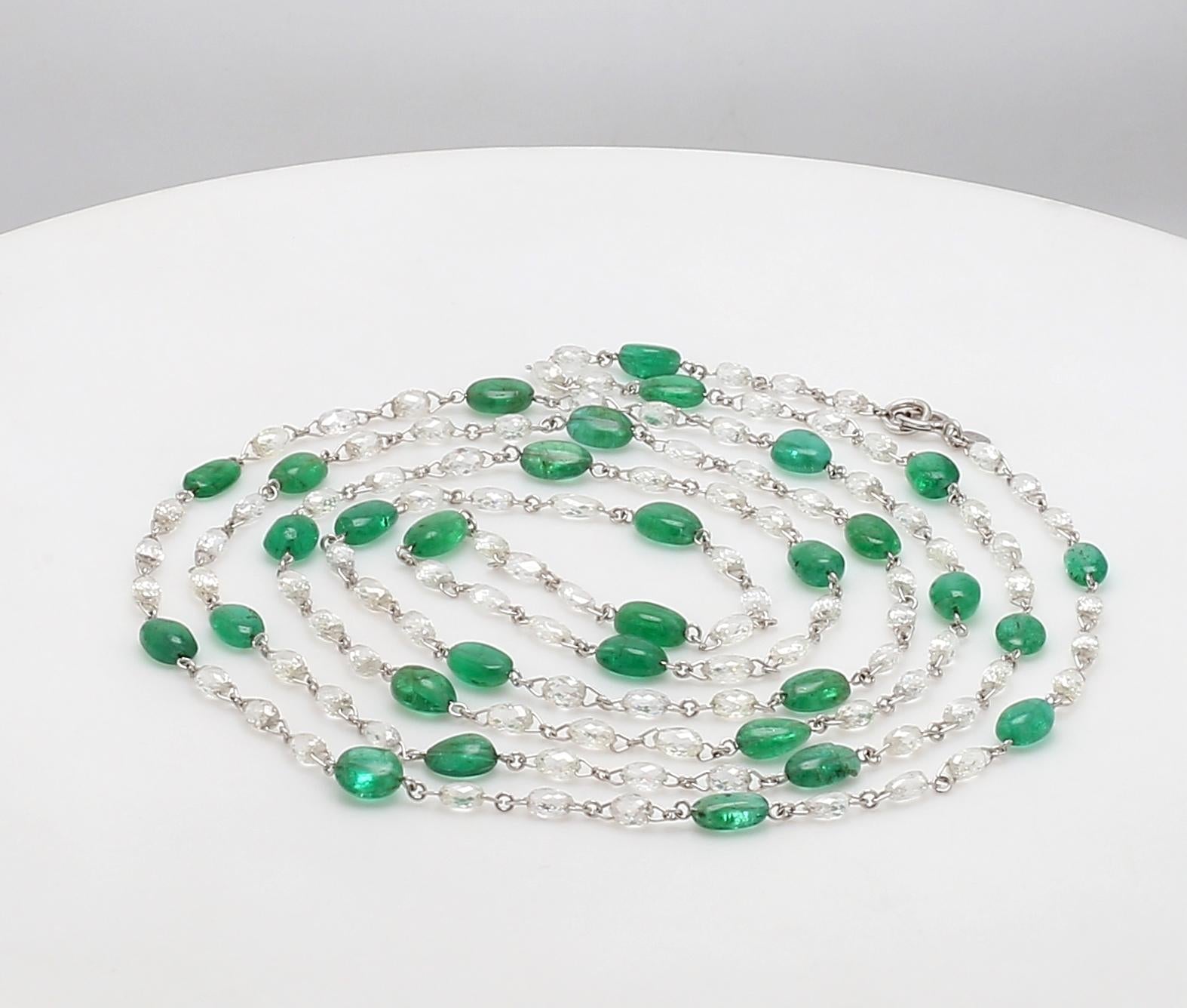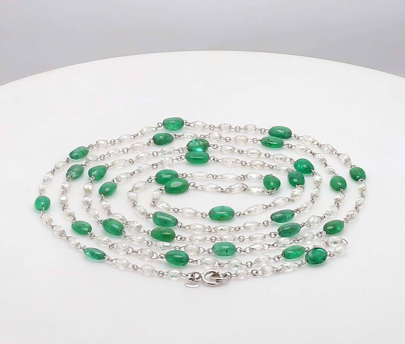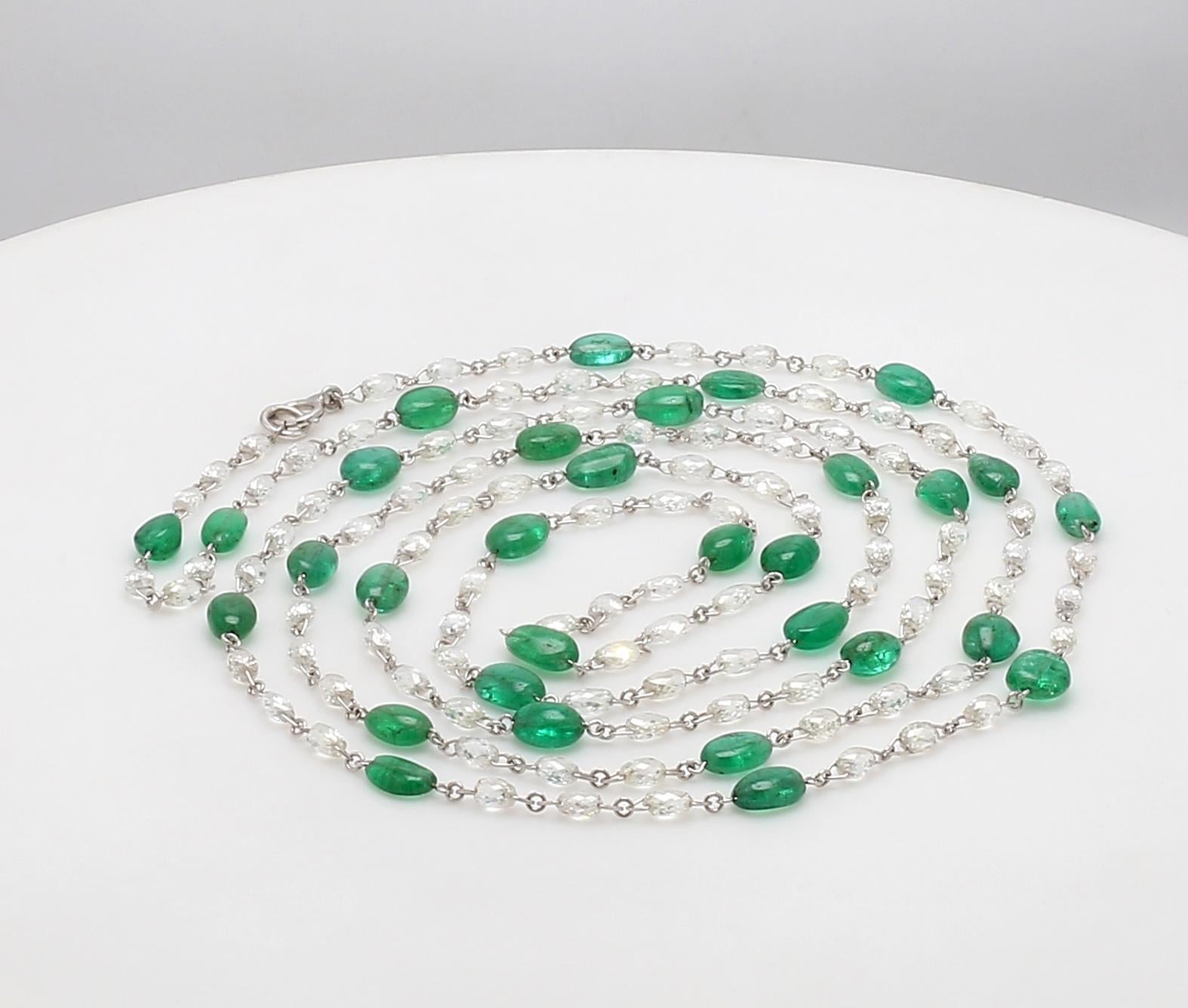A beautiful diamond briolette and emerald & 18k gold long necklace by Panim .The Necklace forms a continuous row of diamonds with very little metal in between ,giving a wonderfully concentrated bright and sparkly look .The longer length makes it versatile piece and it can be worn either on its own for evening or layered with other necklaces and chains for a more casual daytime look.