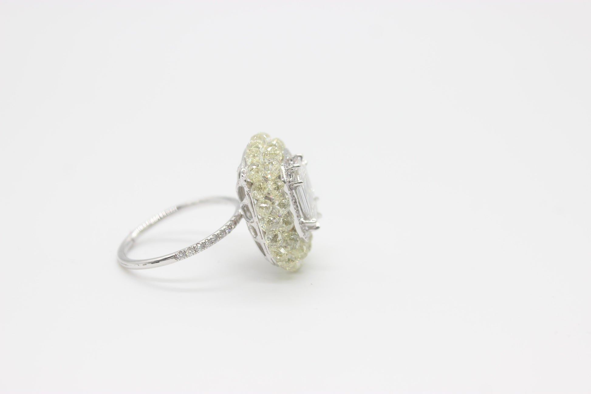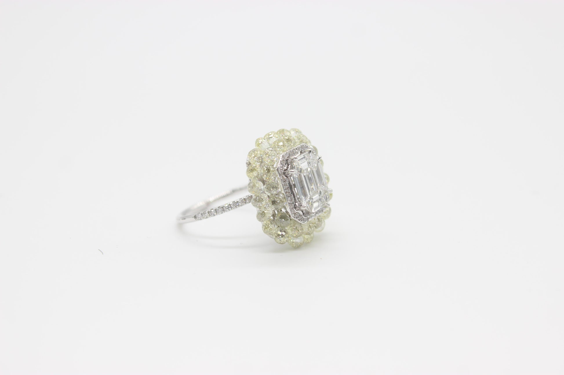 Stunning Panim hand-made 18k white gold ring. The ring is absolutely gorgeous! The ring's emerald illusion center diamond is one of its features. The design's total diamond weight is approximately to be 8.50 carats, and it exhibits stunning scintillation to truly stand out. The emerald illusion diamonds in the centre are G+ in colour and VS in clarity. Two layers of briolette diamonds surround the central illusion diamond as accents.