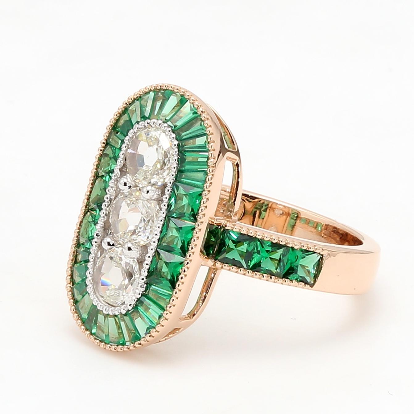 A super 18 karat yellow gold, three stone diamond & emerald ring that displays three bright Old Mine Cut diamonds , with a total estimated 1 cts of white diamonds & 1.40 cts of calibrated emeralds .It is a great ring that would also make a fabulous engagement ring or a great collection to a ladies ring stack.