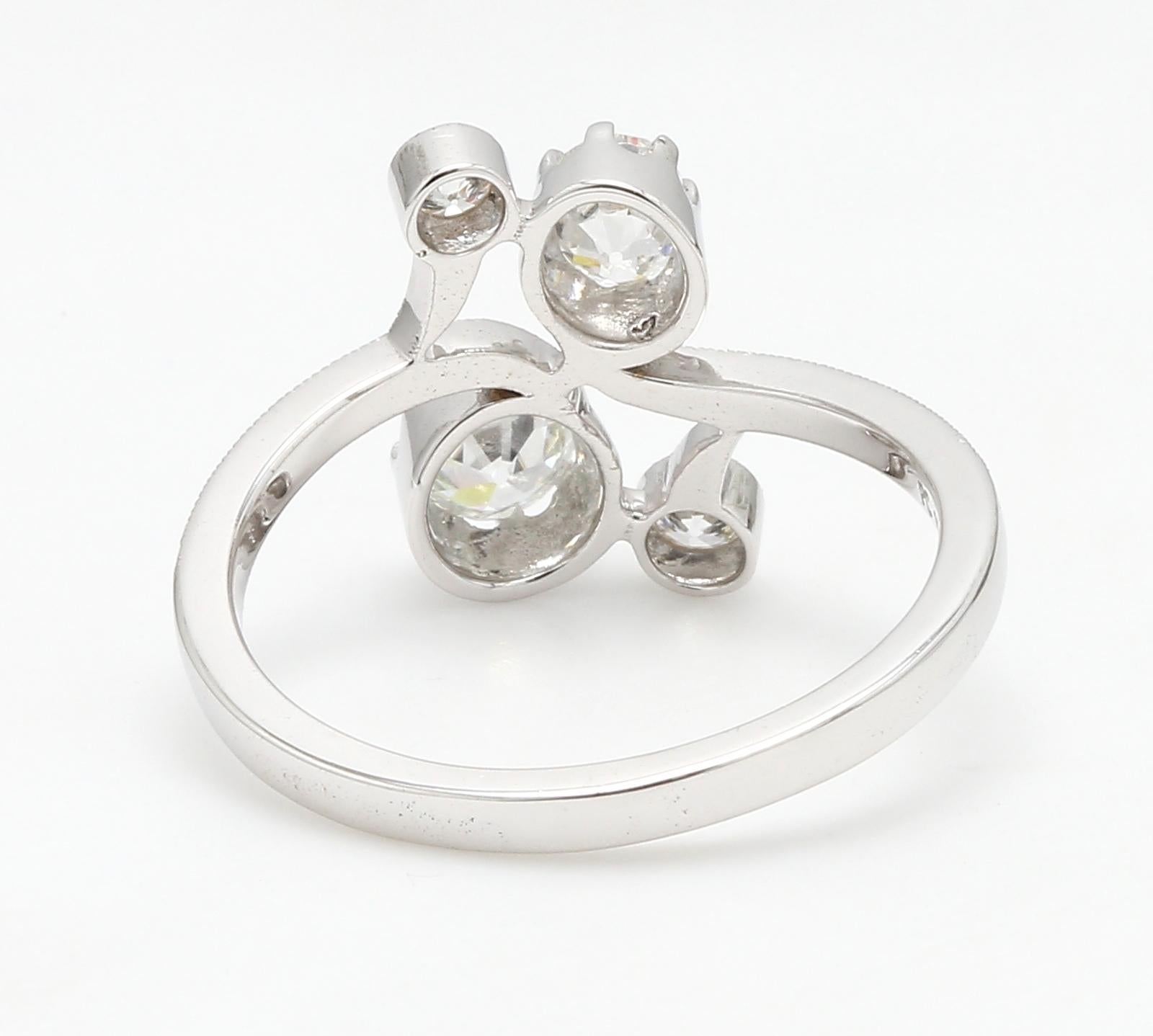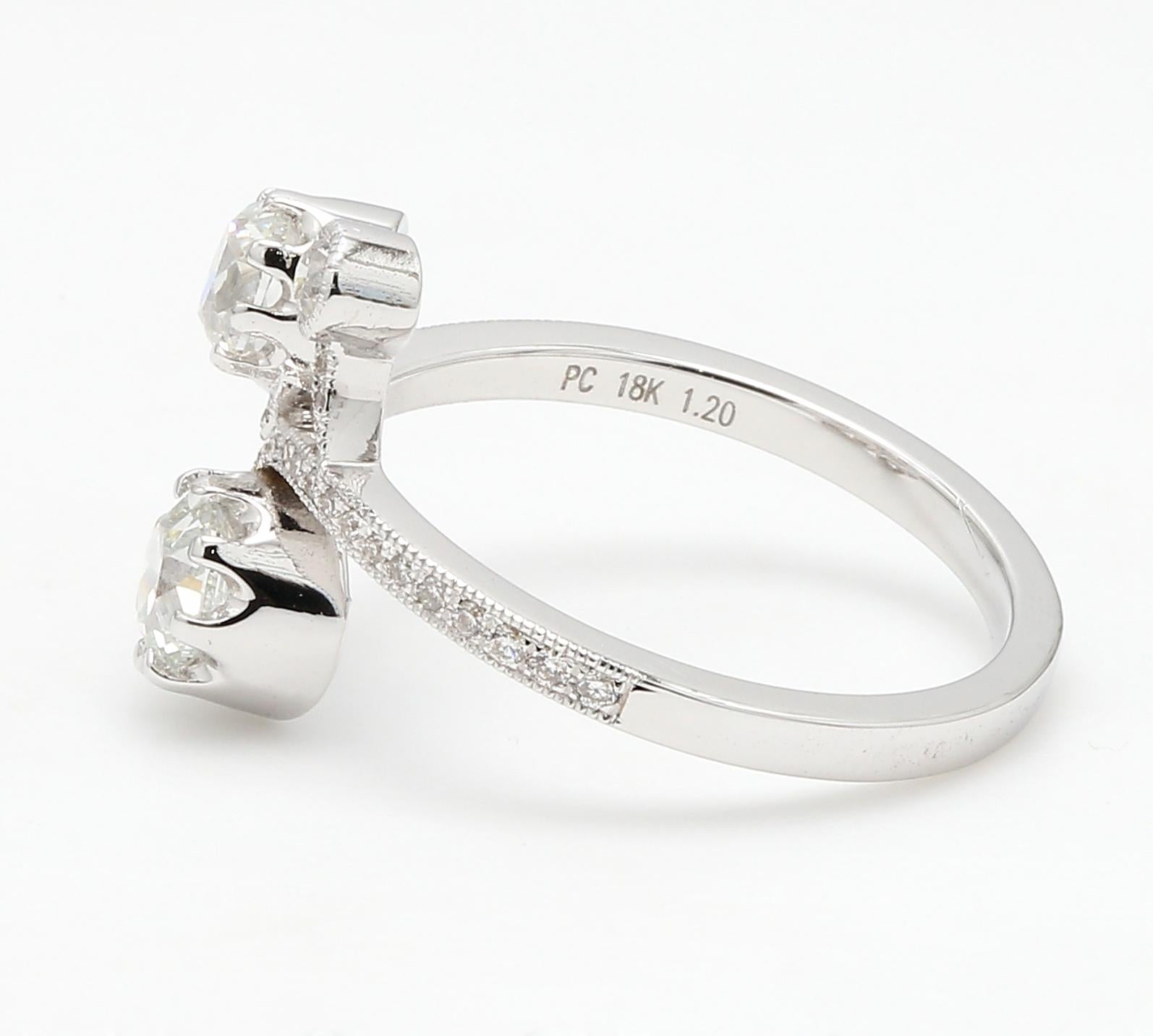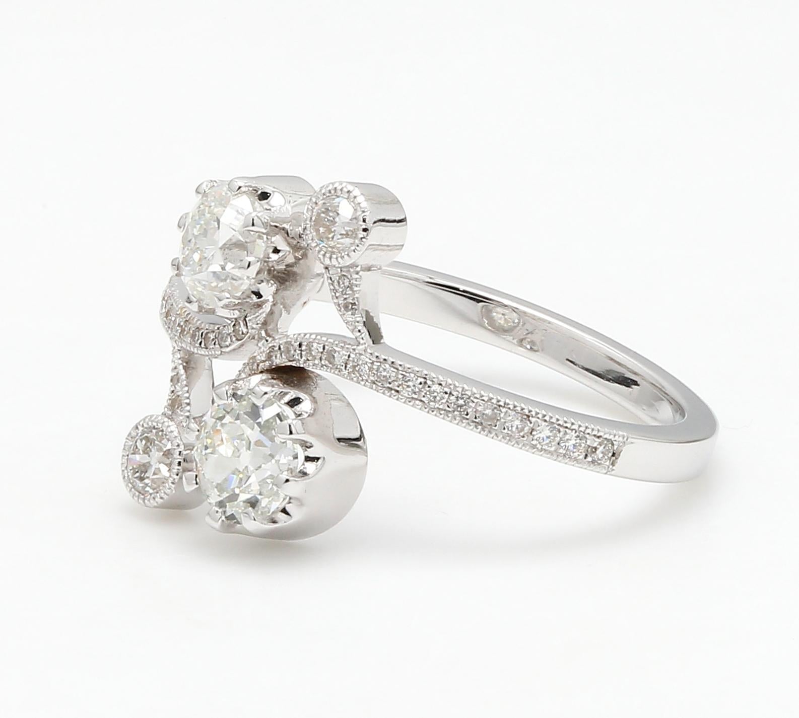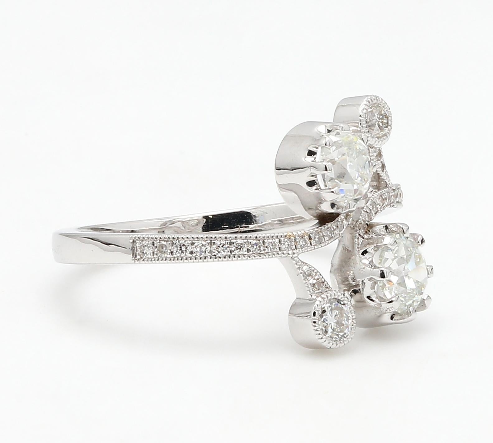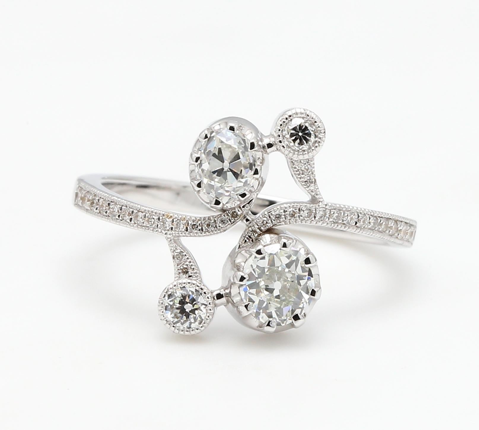 This is an extraordinary Russian Art Nouveau, Old Mine Cut Diamond Ring. The Old Mine Cut Diamonds are set in 18k White Gold maximizes the brilliance of the diamonds. The Old Mine Diamonds sparkle with the radiance and brilliant white color of the fabulous antique diamonds. The Russian Art Nouveau rings have the most wonderful unique shapes and designs. This is one of the most beautiful with the diamonds set in an open work motif. These pieces require artisans of the highest quality to create the jewels. The Art Nouveau jewels found their inspiration in the curving forms of nature. The ring is a spectacular antique engagement or wedding ring, cocktail ring or a treasure to be worn every day.