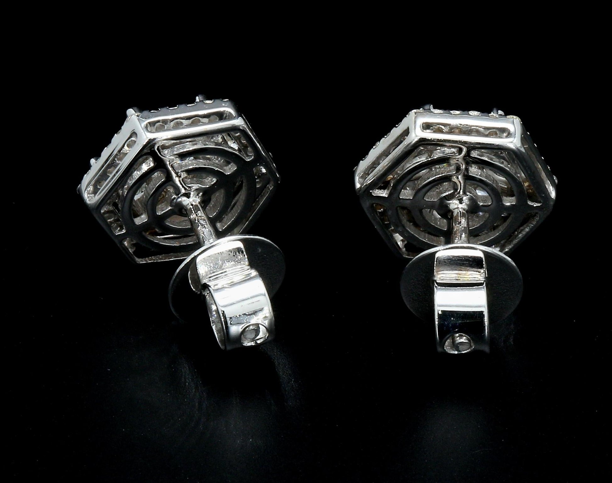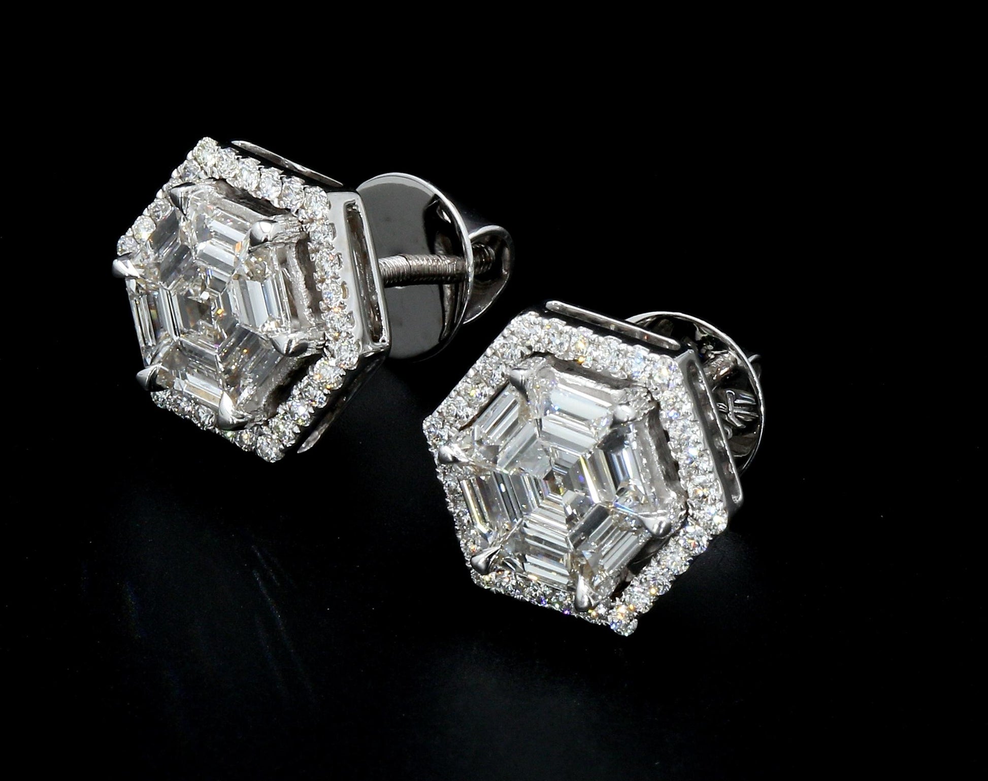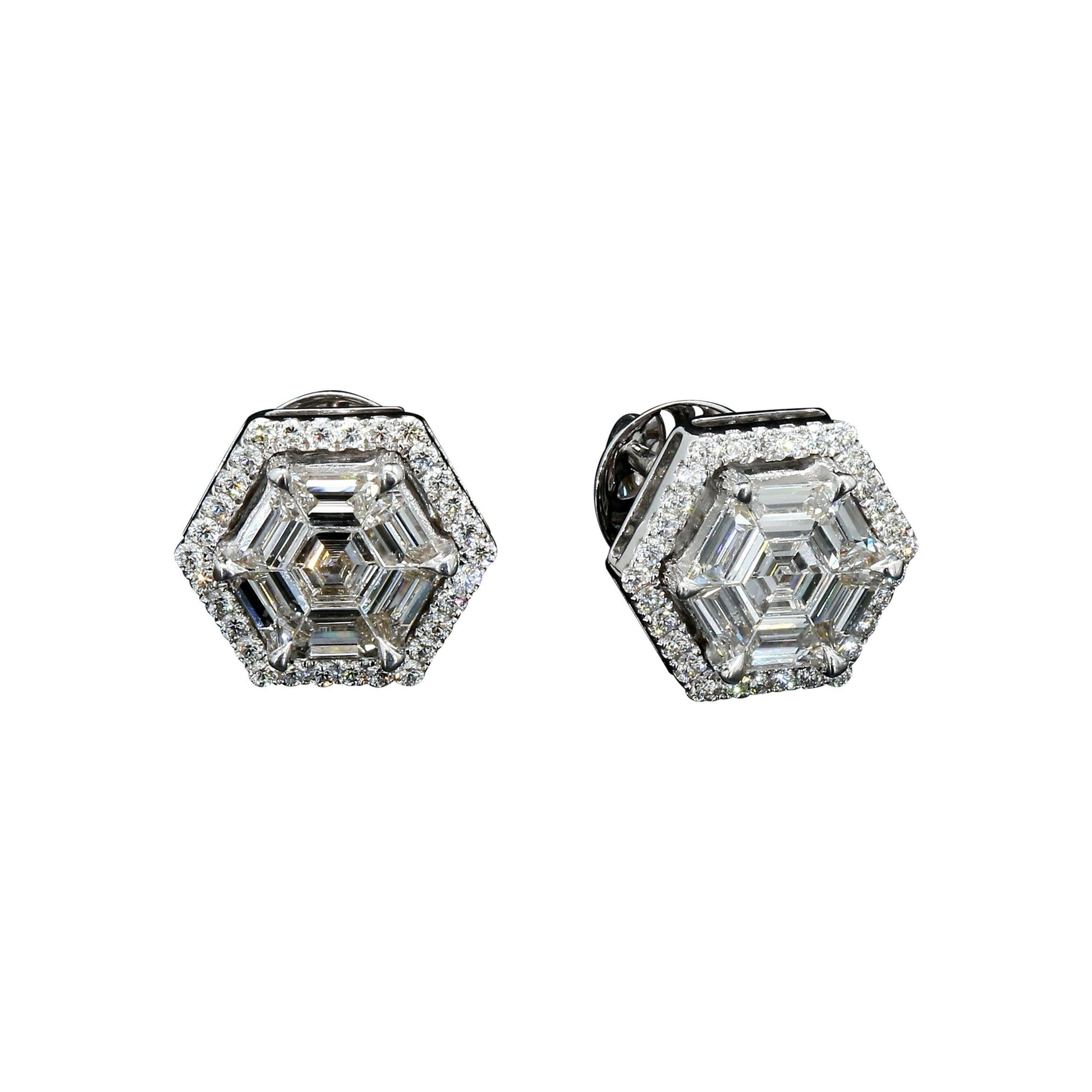 This diamond Earrings have a Hexagon shape Illusion to create the look of 5.00 to 5.50 carat single Hexagon cut stone surrounded beautifully with brilliant round diamonds, Handcrafted in 18Karat White gold, the total diamond weight of this ring is 1.34 carats.