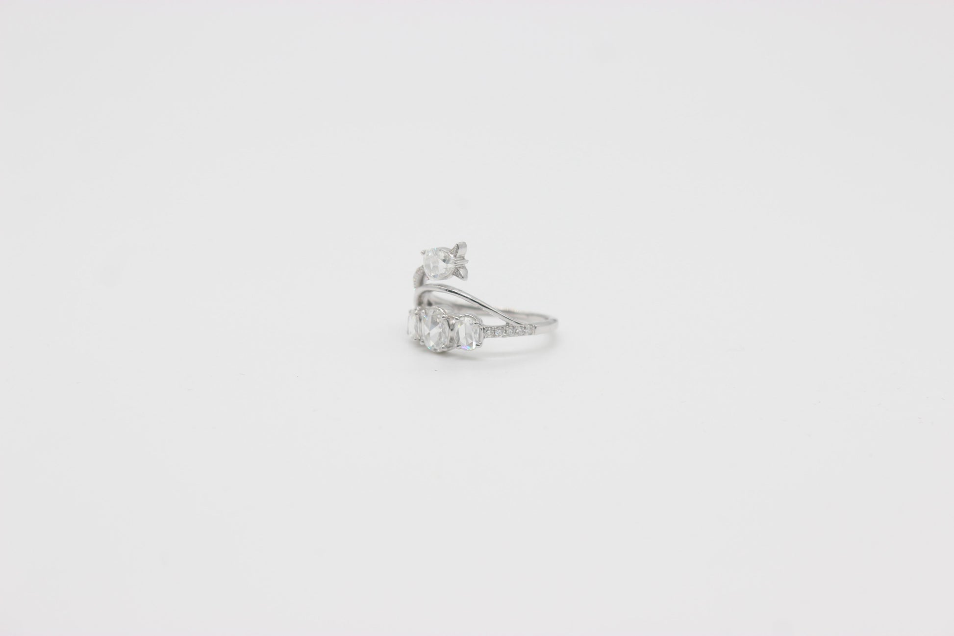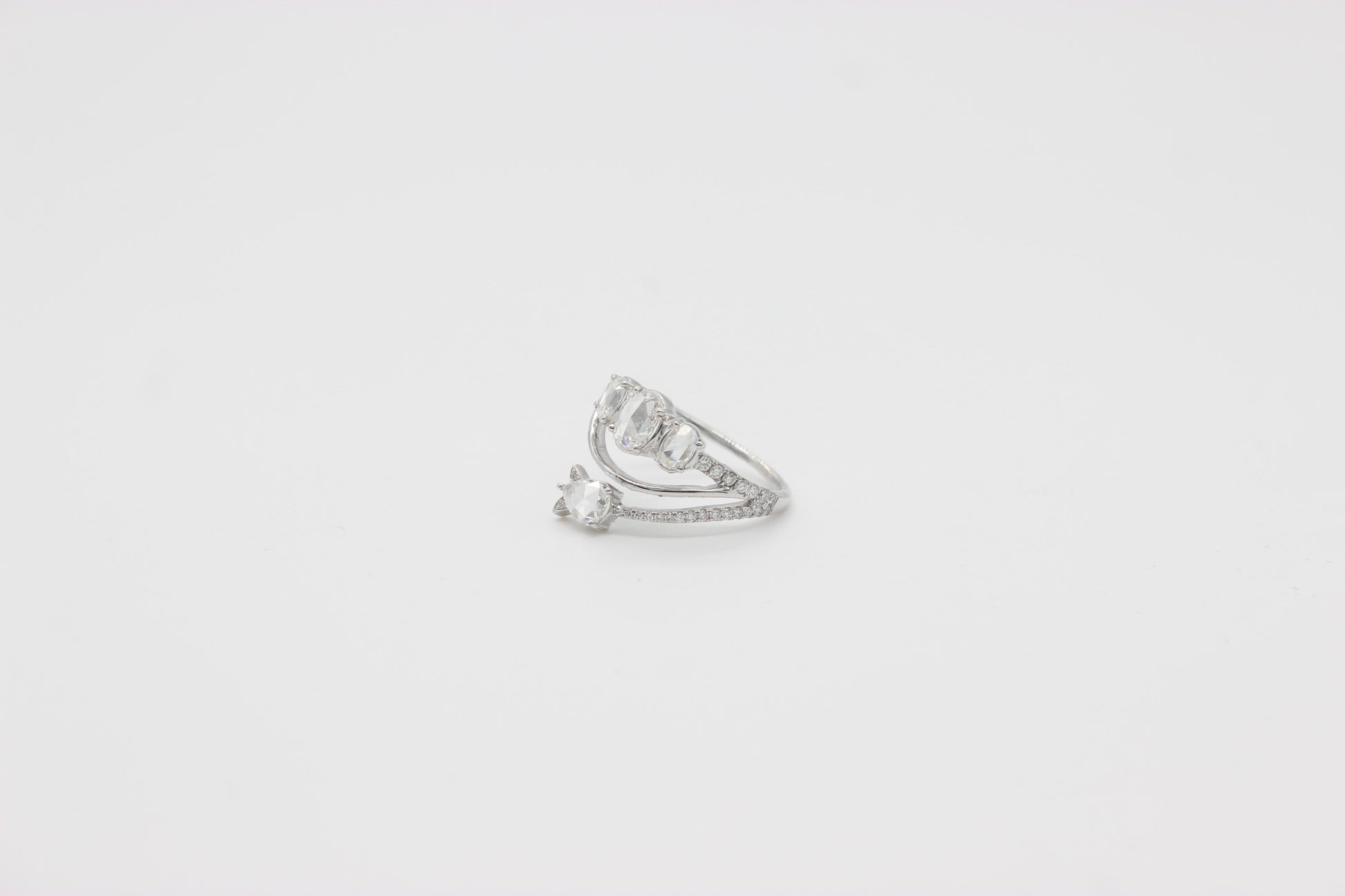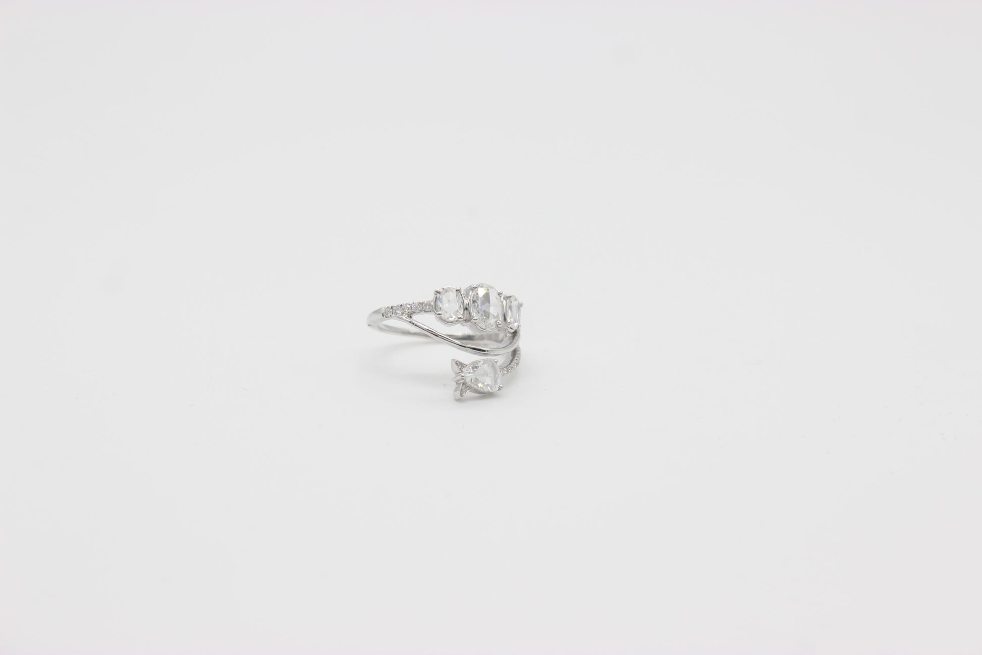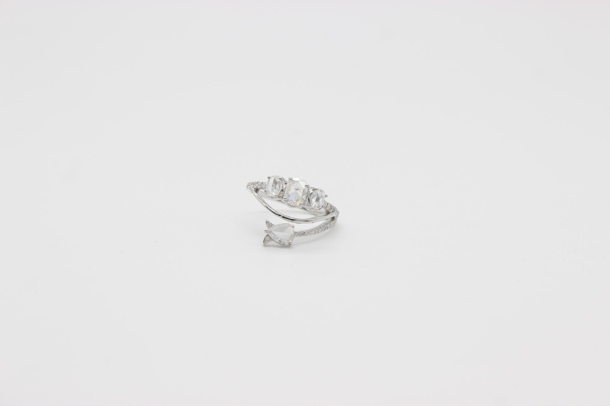 For generations, people have worn past, present, and future rings as a symbol of life and enduring love. These rings are so unique and heartfelt, and they are still a well-liked ring style. This gorgeous diamond ring features a rosecut diamond flower arrangement. Four white gold prongs hold each diamond in position as it is set in white gold. The settings complement the ring's design and raise the diamond's brilliance! Together, these diamonds weigh about 1 carat total weight, giving off a stunningly voluminous appearance without being overpowering.