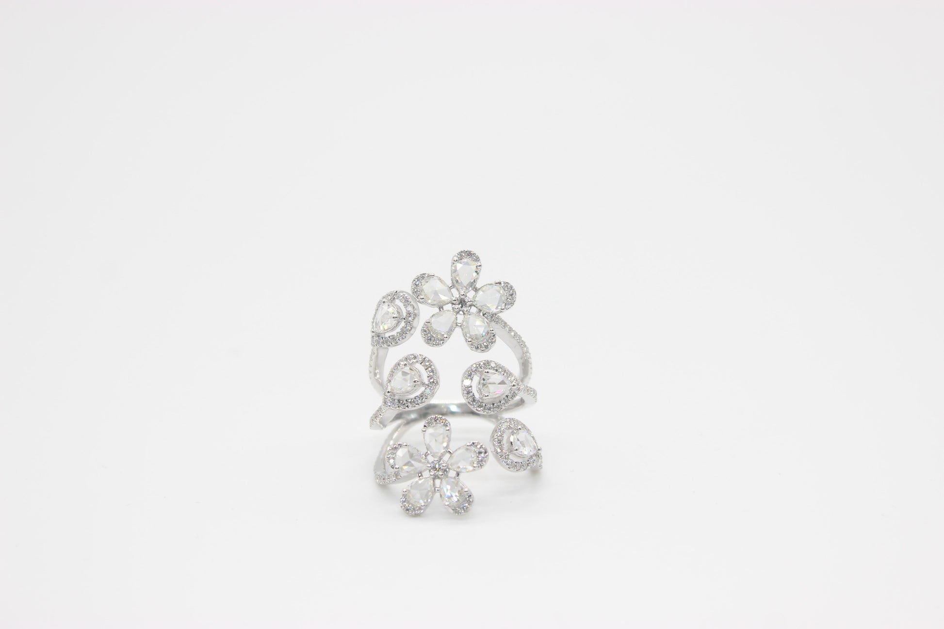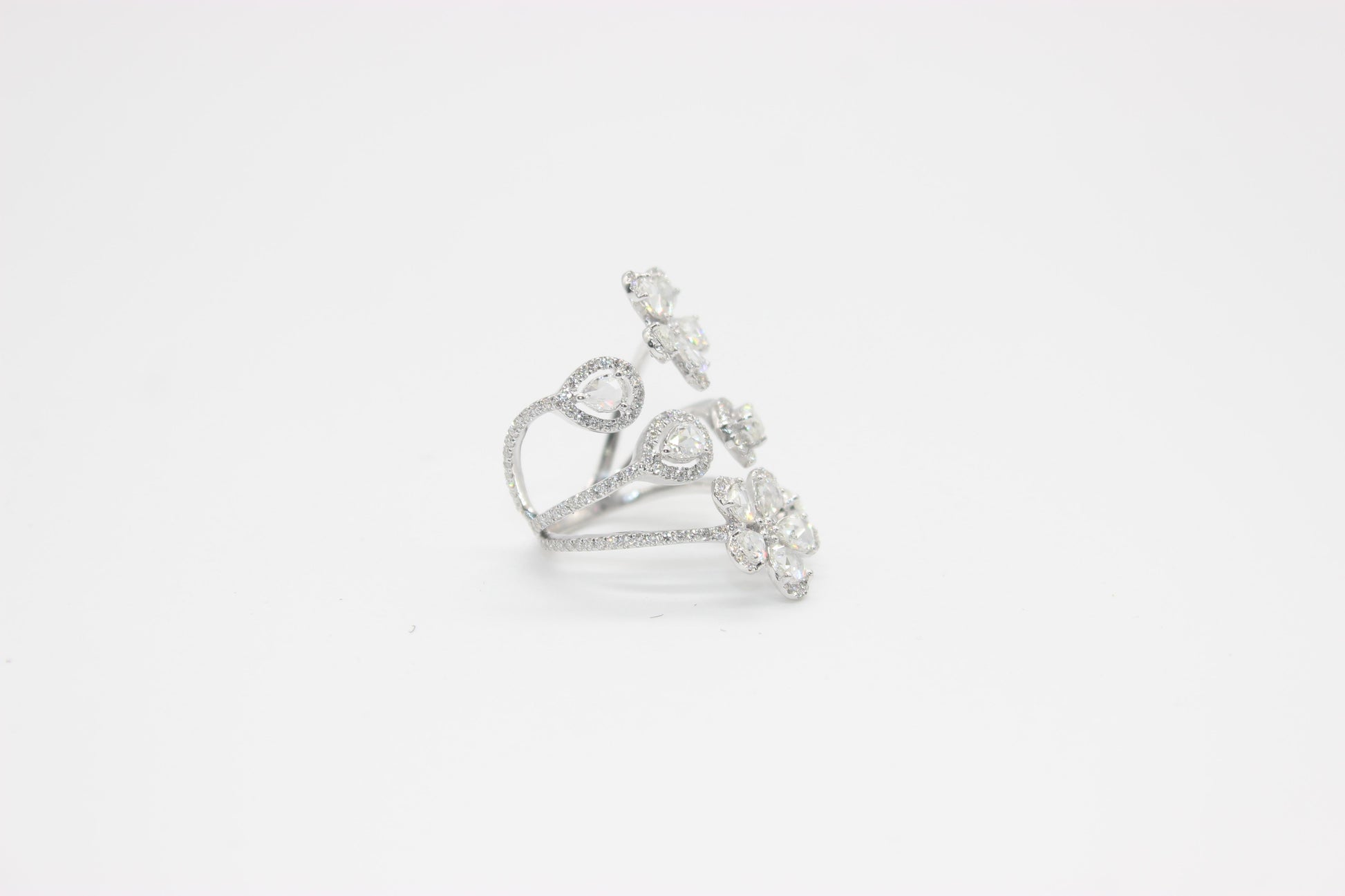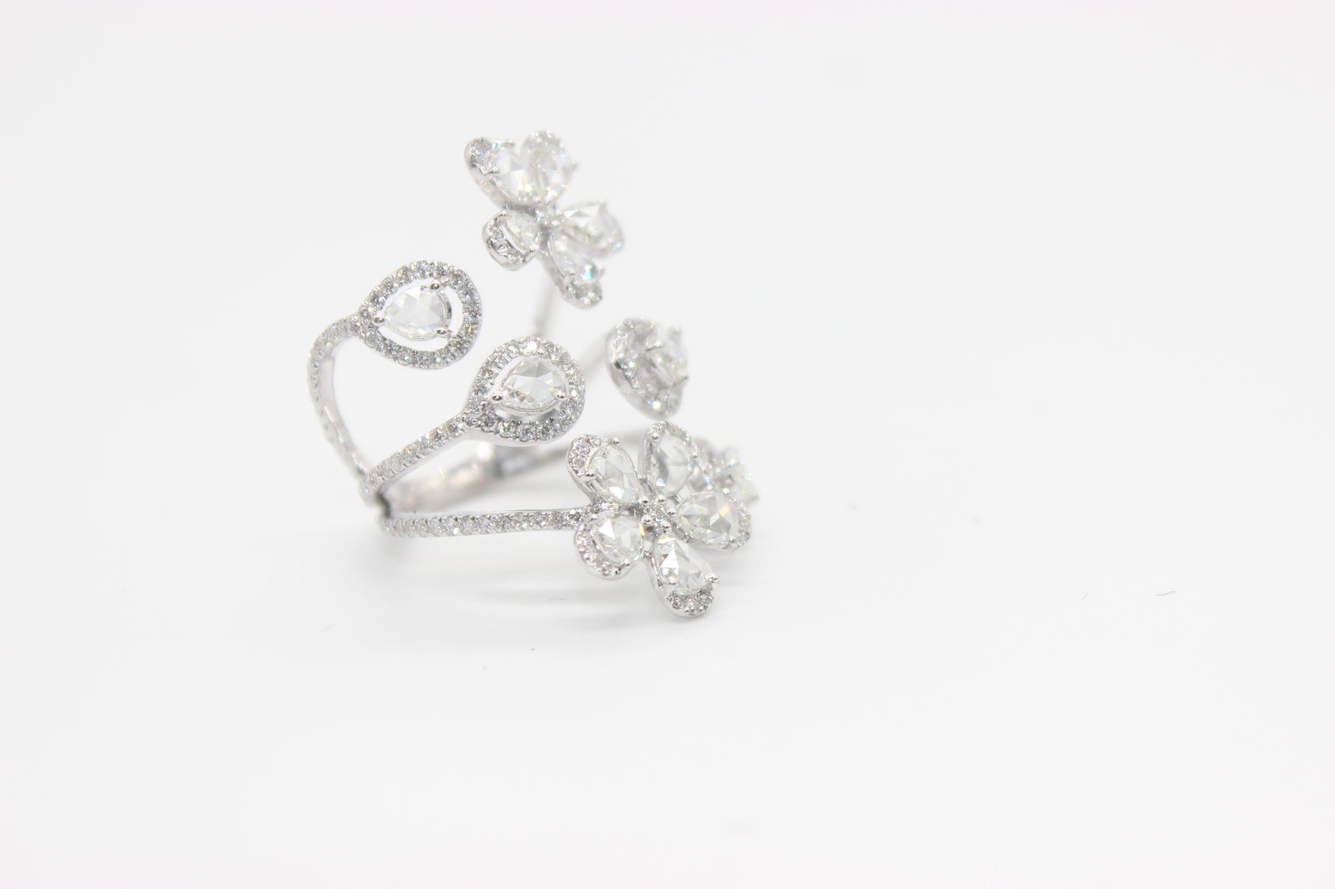 This ring is primarily made up of floral designs and is part of the Panim Floral collection. The ring wraps the finger in a variety of flower designs. This ring can be worn for a number of events because of its design. Our artists carefully arrange each petal, which is surrounded by a pear-shaped diamond rosecut and round brilliant diamonds. The ring is currently a size US 6, but it can be altered for the ideal fit.