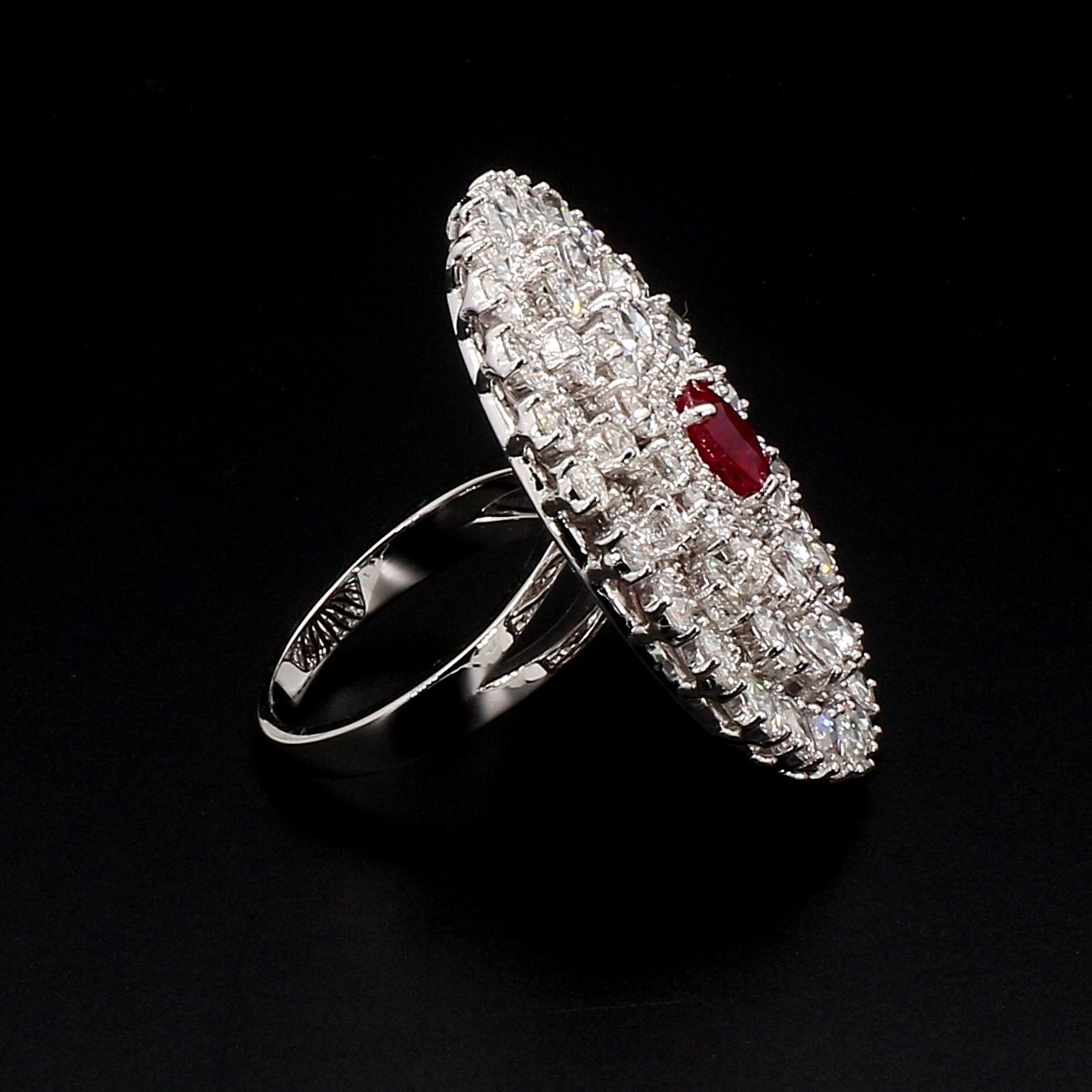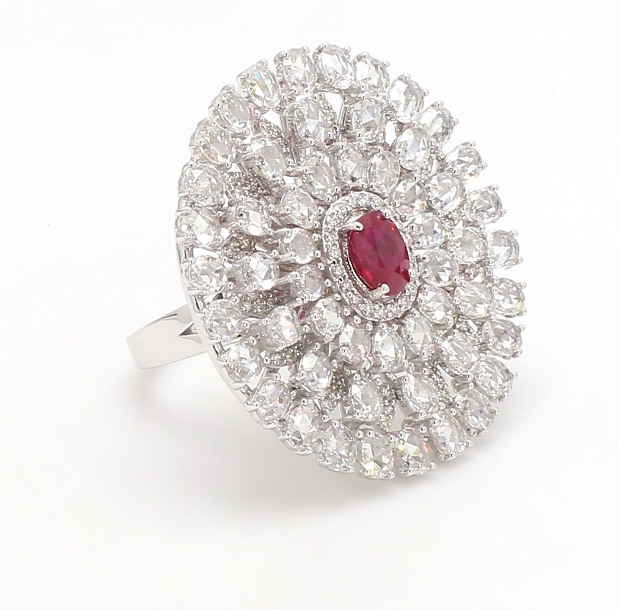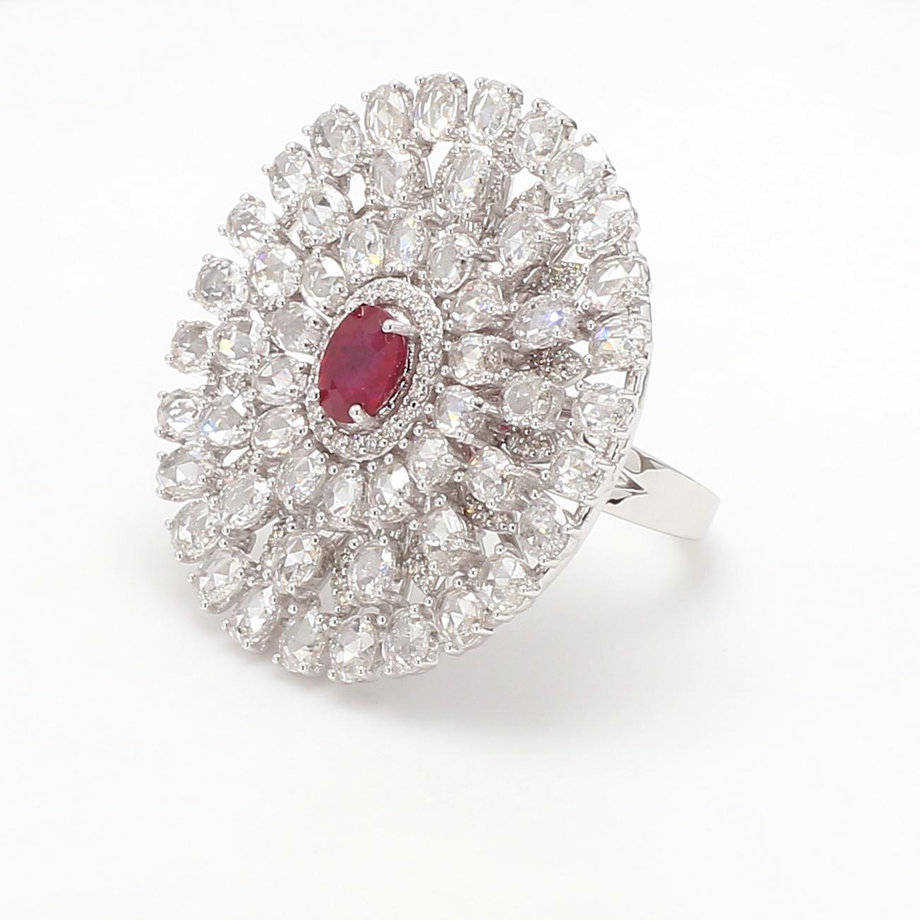 This Diamond Rosecut floral ring is a perfect fit to make a bold statement . Mixed with Oval rose-cut essence, this ring features a Oval shape ruby surrounded by the oval shape diamond rosecut petals. This artistic ring is a truly work of art. Despite its size it sits very comfortably on even the smallest of hands.