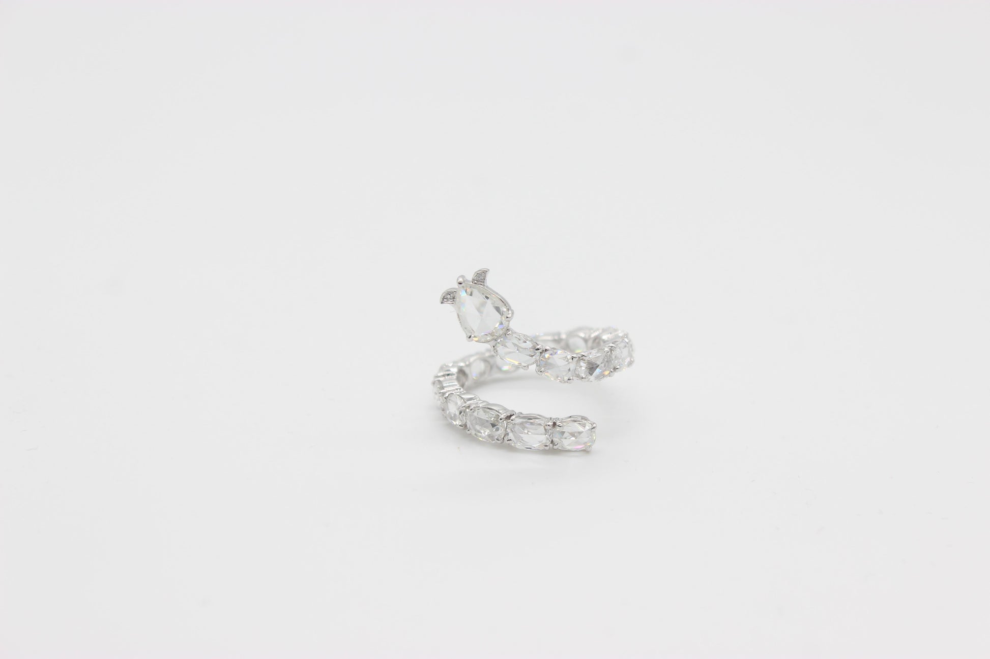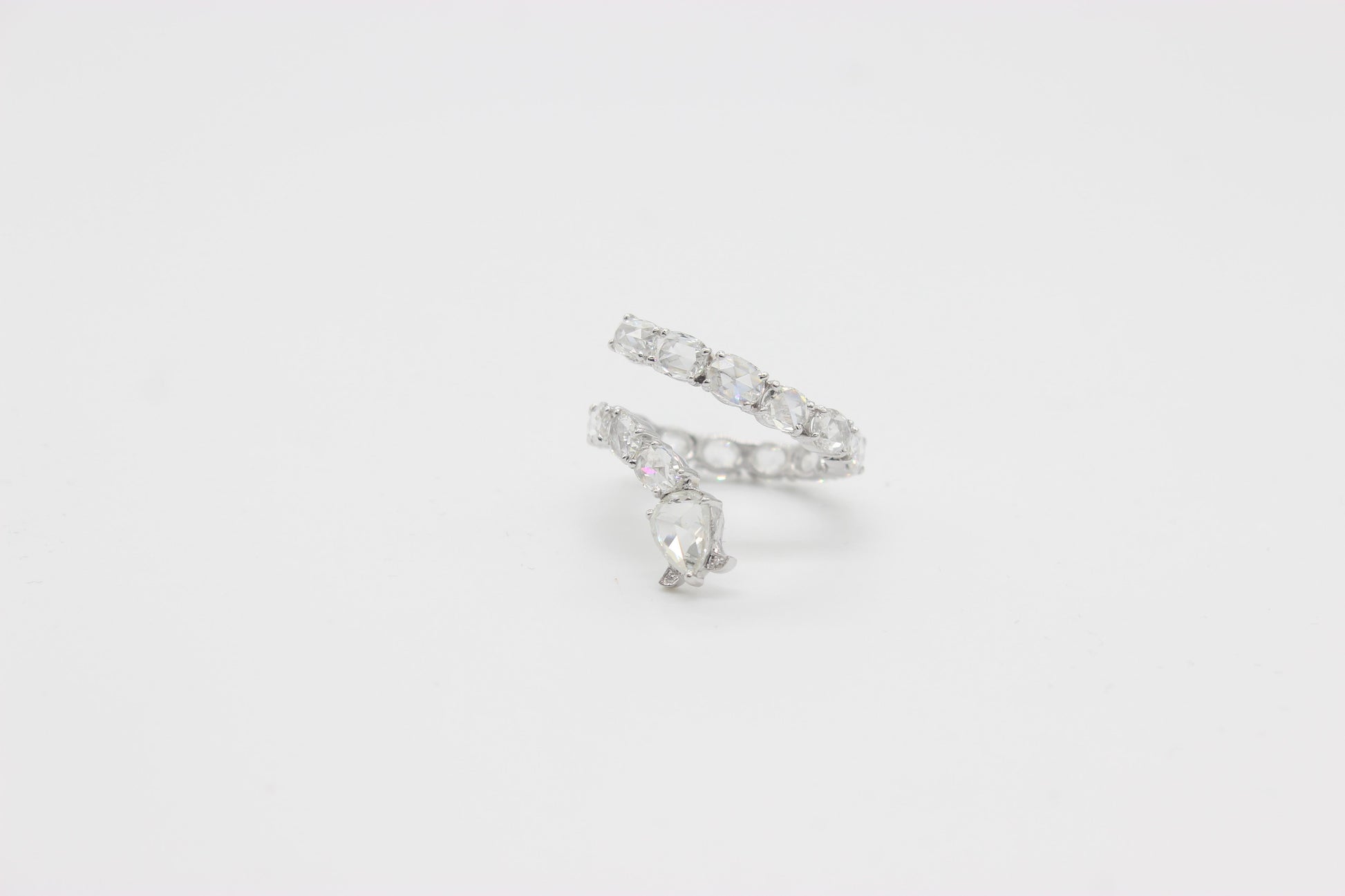 An 18k White gold diamond ring by PANIM from the Serpenti collection. The ring is in the form of a serpent wrapping around the finger, comprising Rosecut Diamonds graduating flexible intersections including the diamond set head of a snake. The head has One Big Pear Shaped Rose cut diamonds graduating in size, with a total diamond weight of 3.87ct.