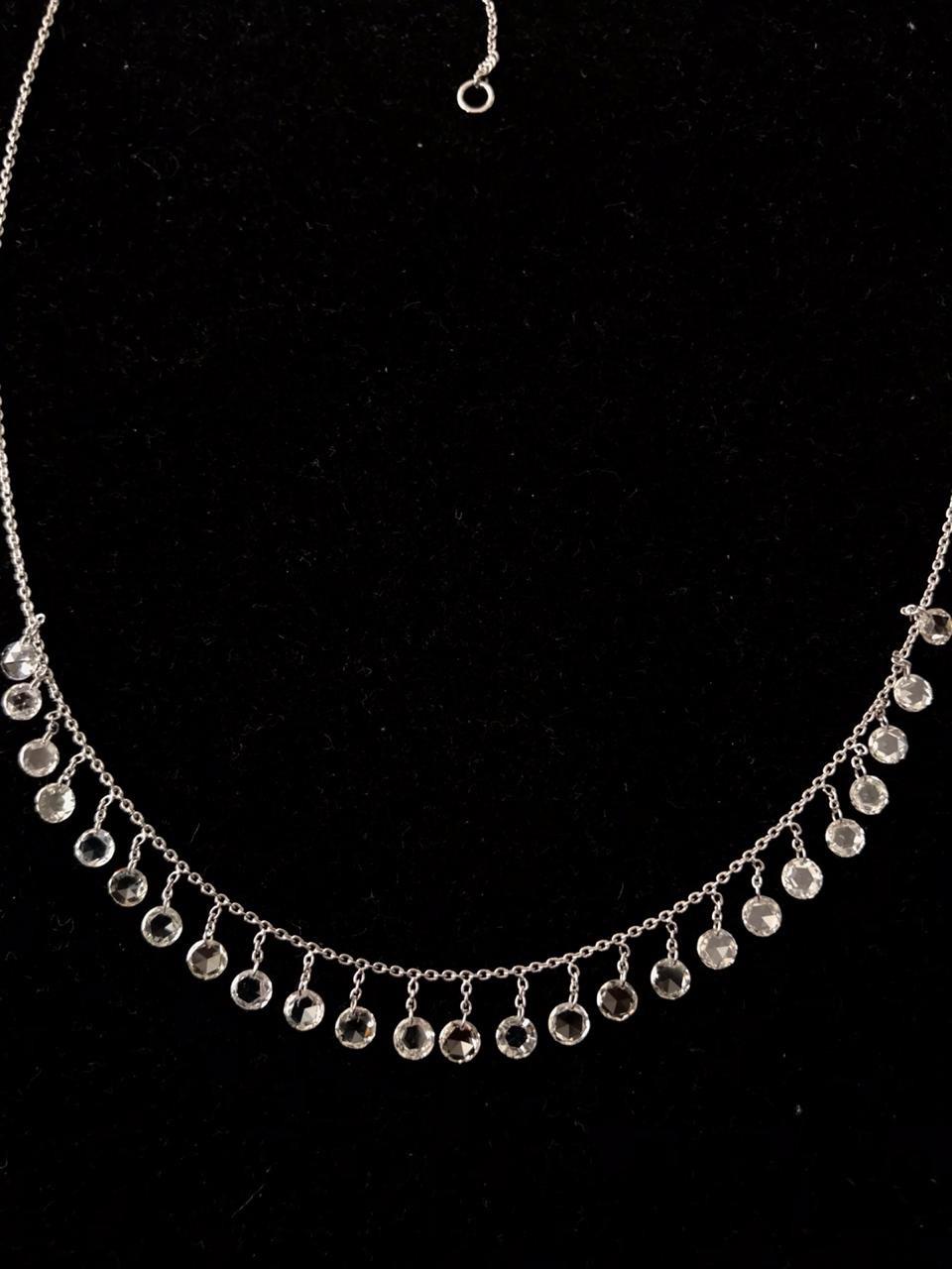 This dangling necklace has a wonderfully warm feel thanks to the 18K gold and colourless Round Shape Diamond Rosecut . Each round diamond rosecut glints quietly when it catches the light and is made to float delicately on your neck.