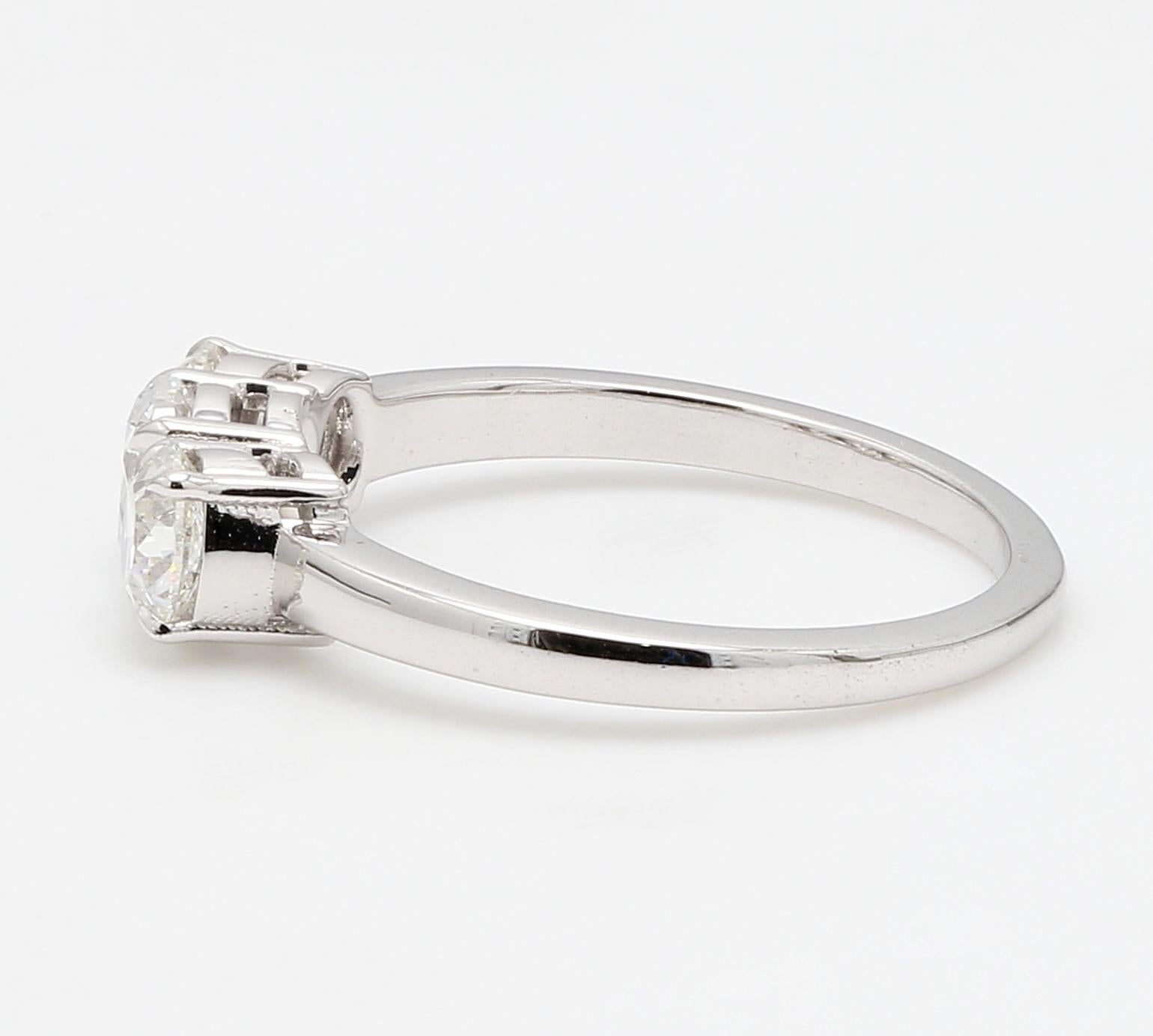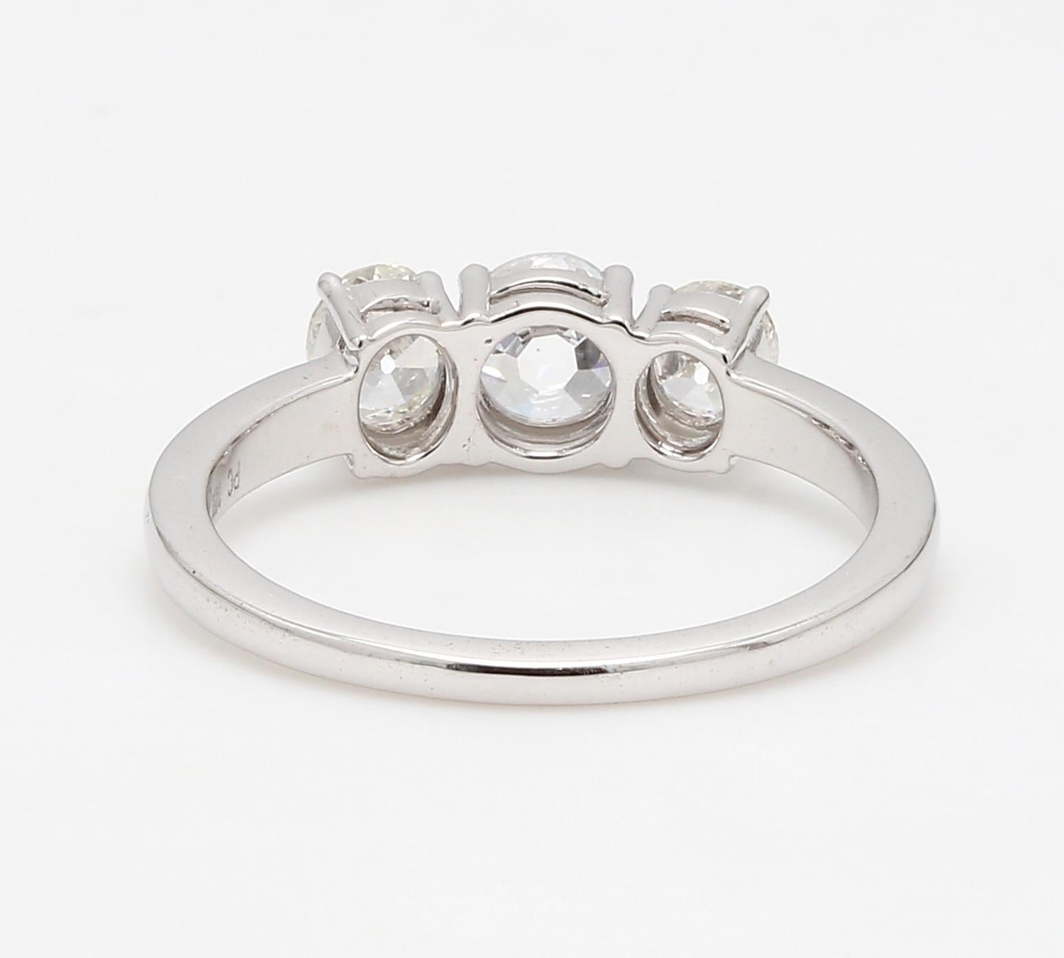 A stunning 18k white gold three stone European old cut diamond ring with a center stone of 0.50ct and two flanking diamonds each 0.30ct making a total carat weight of 1.11cts. These sparkling old cut diamonds are mounted in a 4 claw setting, displaying the diamonds to their best advantage, simply. This ring would make a super engagement ring or simply to celebrate one of life’s special moments.