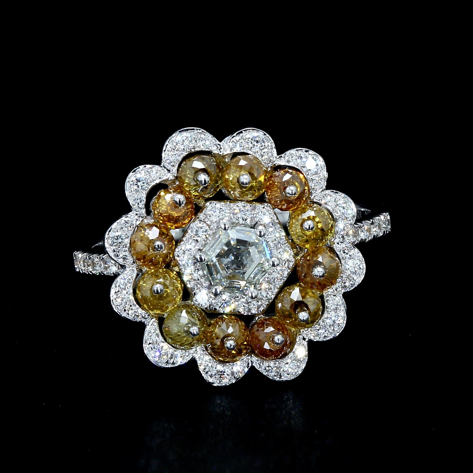 This ring features a hexagon shape and a hexagon shape diamond at the center of the ring and the natural fancy color diamond beads surrounding the center stone ,Surrounding the diamond beads are the pave set white round diamonds