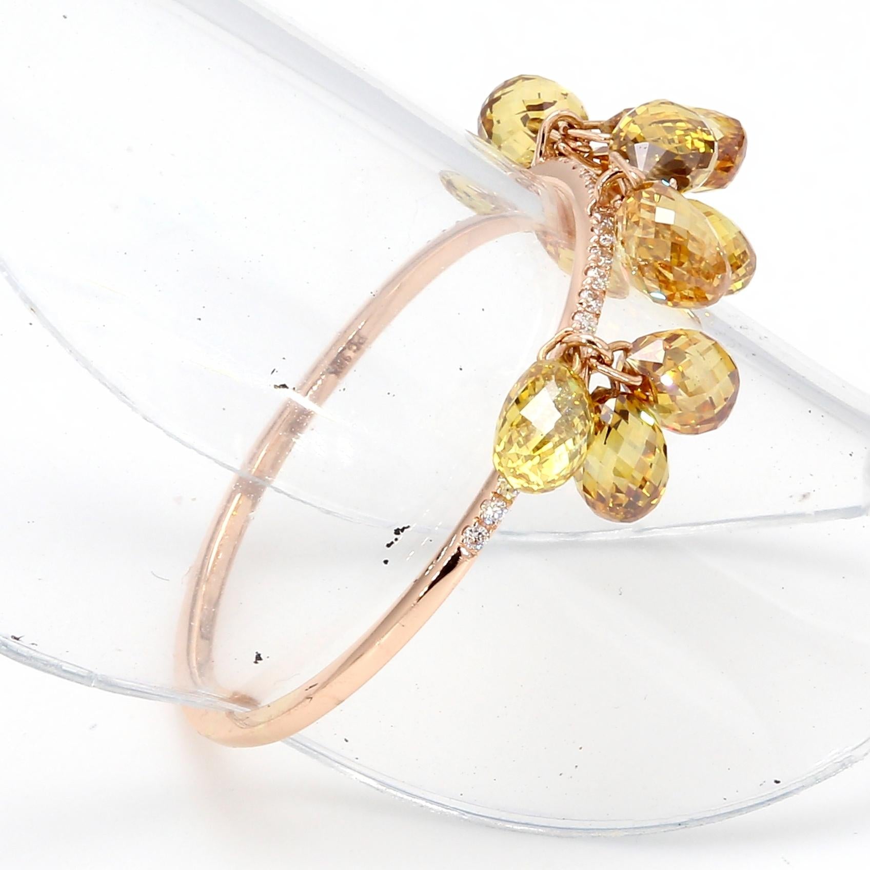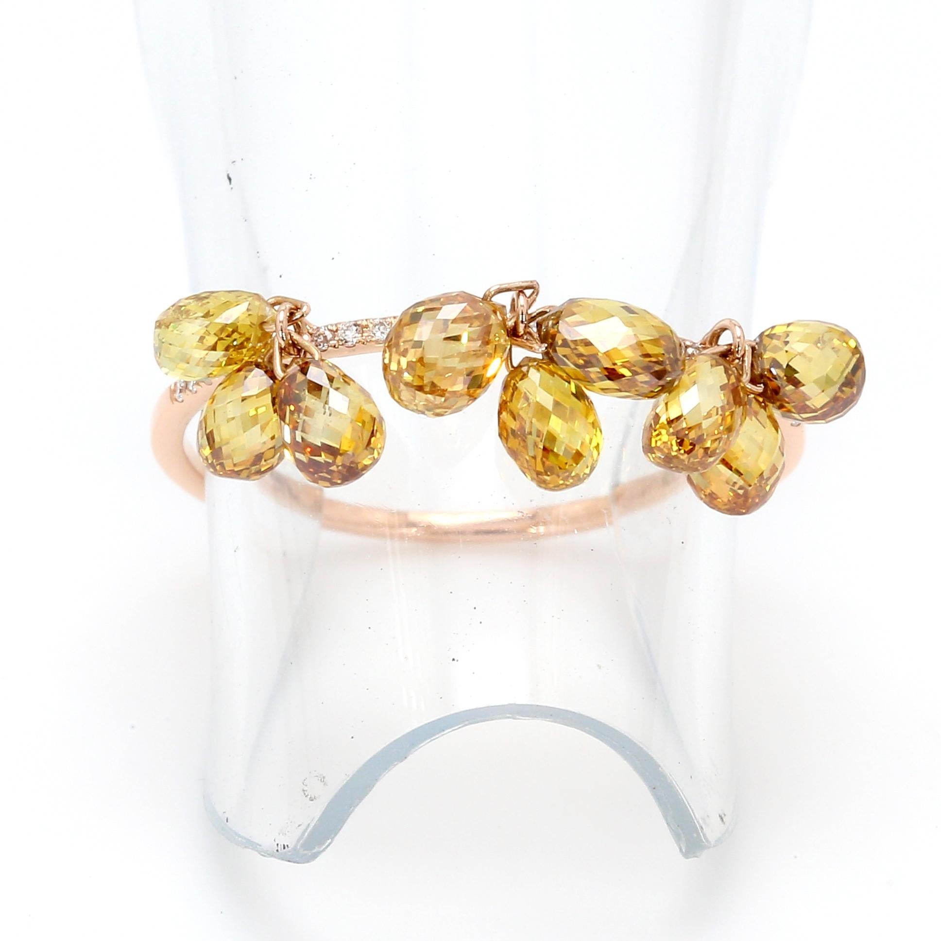 This Panim Dangling Drop Briolette Ring is inspired by the beauty of Rain drops is an absolute delight to the eyes. The ring features 9 pieces of natural fancy color briolettes and small round brilliant diamonds on the band. The rings can be stacked upto 4 rings or more and can be made to look like huge cluster of Diamond Briolettes dangling and shining from everywhere