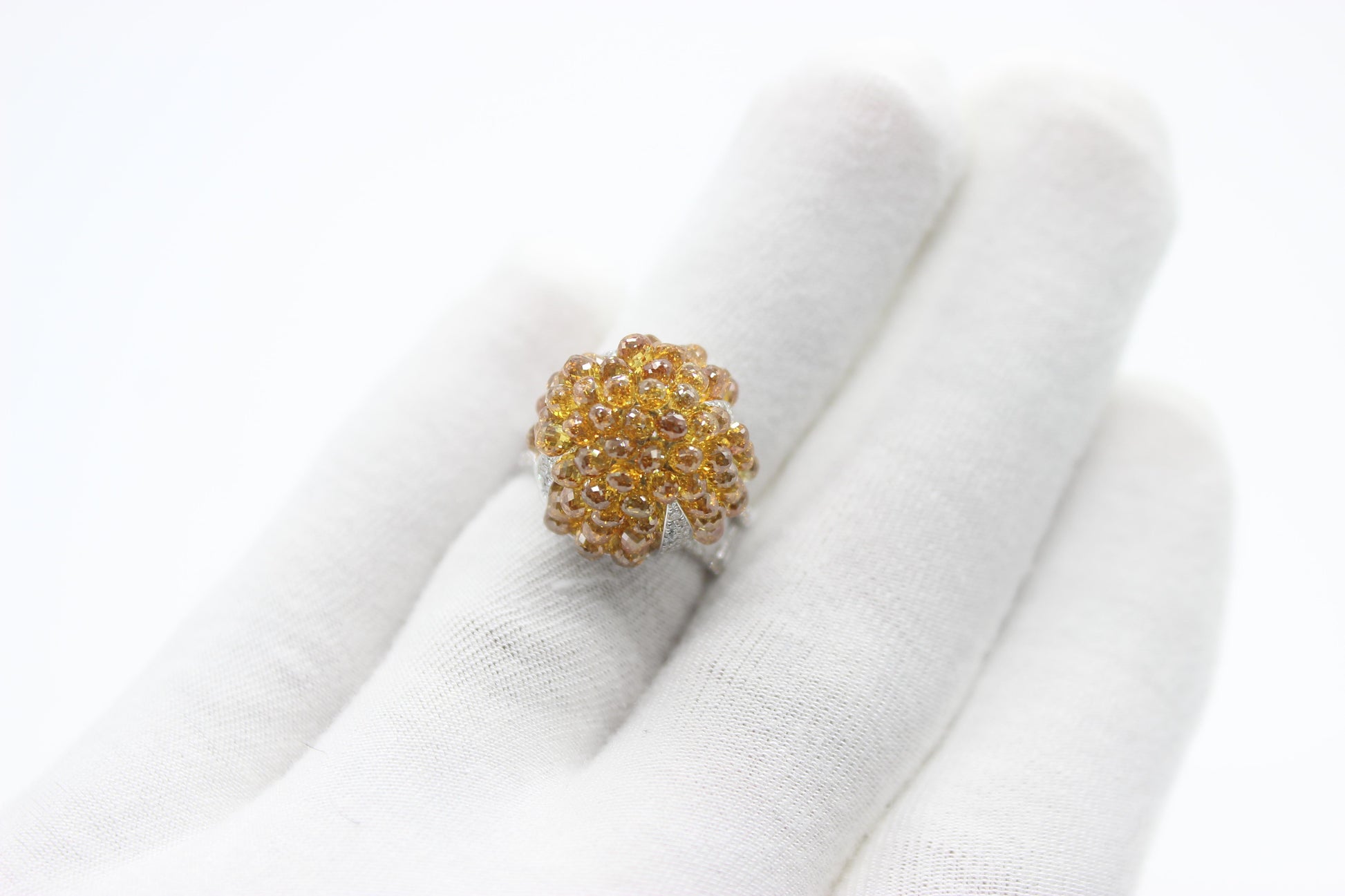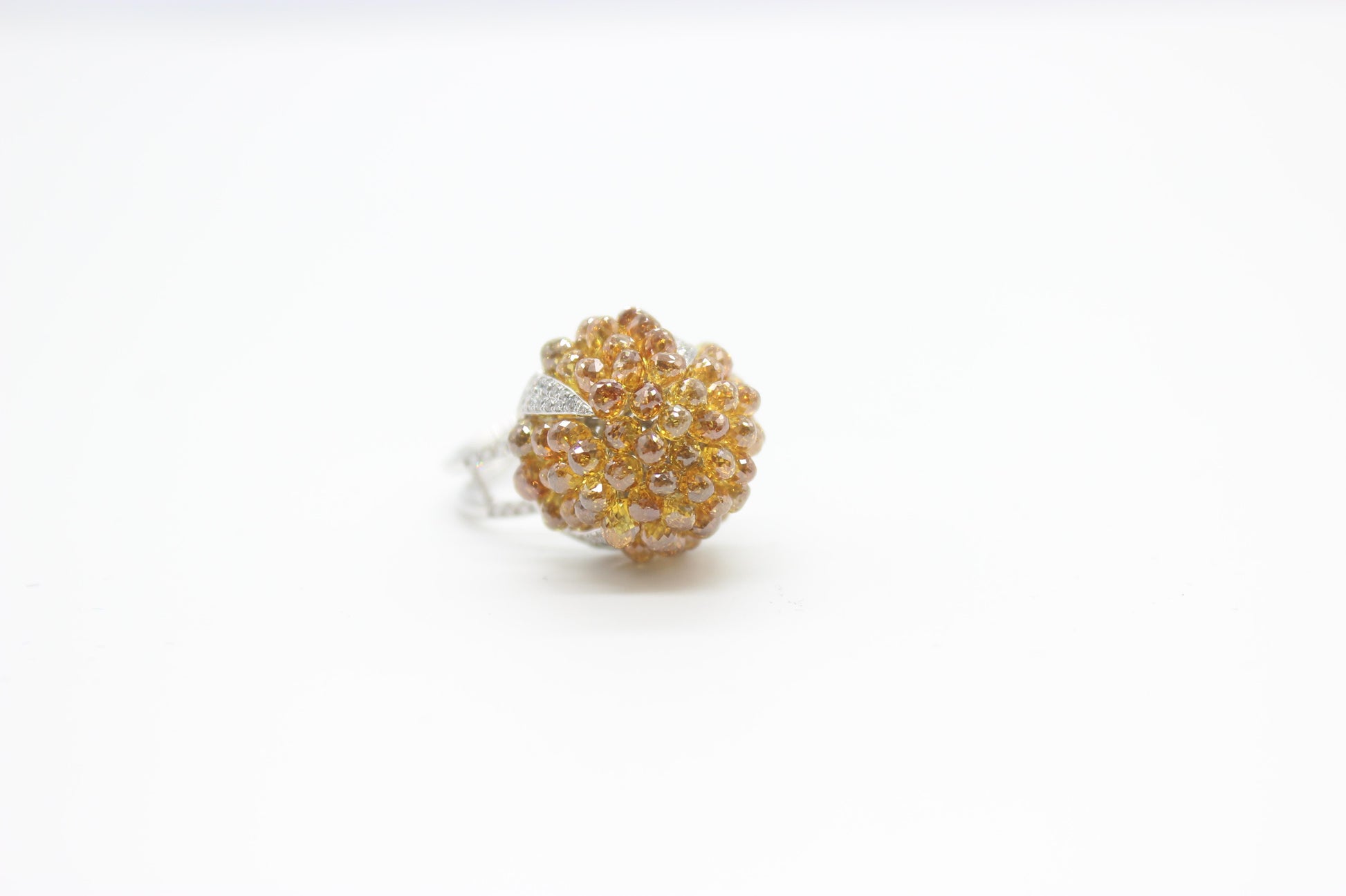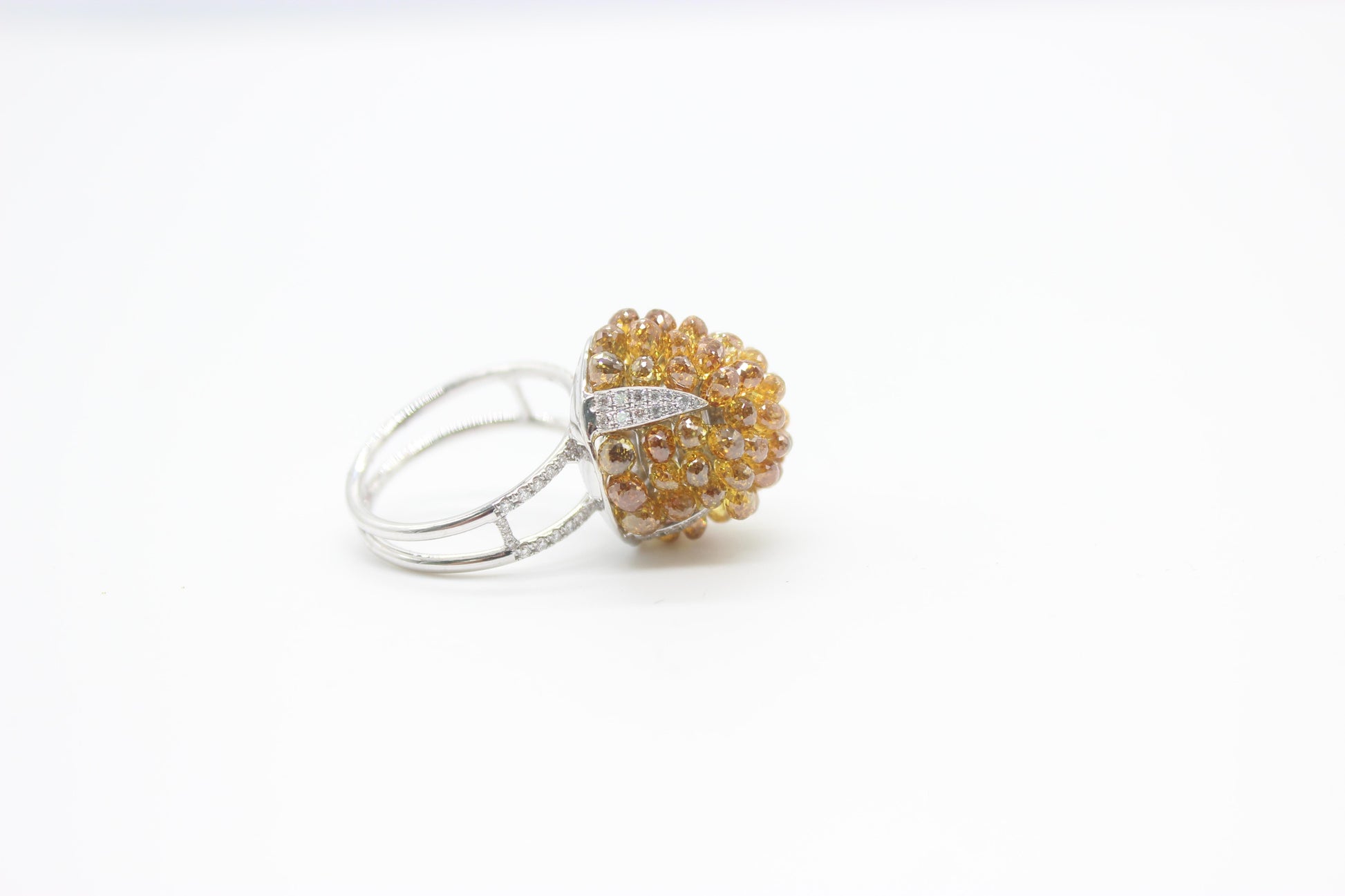 This gorgeous ring is made in 18 Karat white gold and features natural fancy colour briolette cut diamonds . The Ring sparkles beautifully with a sea of natural fancy color briolette diamonds, has a distinctive and lovely design that gives the ring a dynamic appearance. The result is glamorous and stunning yet beautiful! This alluring Panim ring, which is set in luxurious 18K white gold, will make you stand out from the crowd no matter how you wear it.