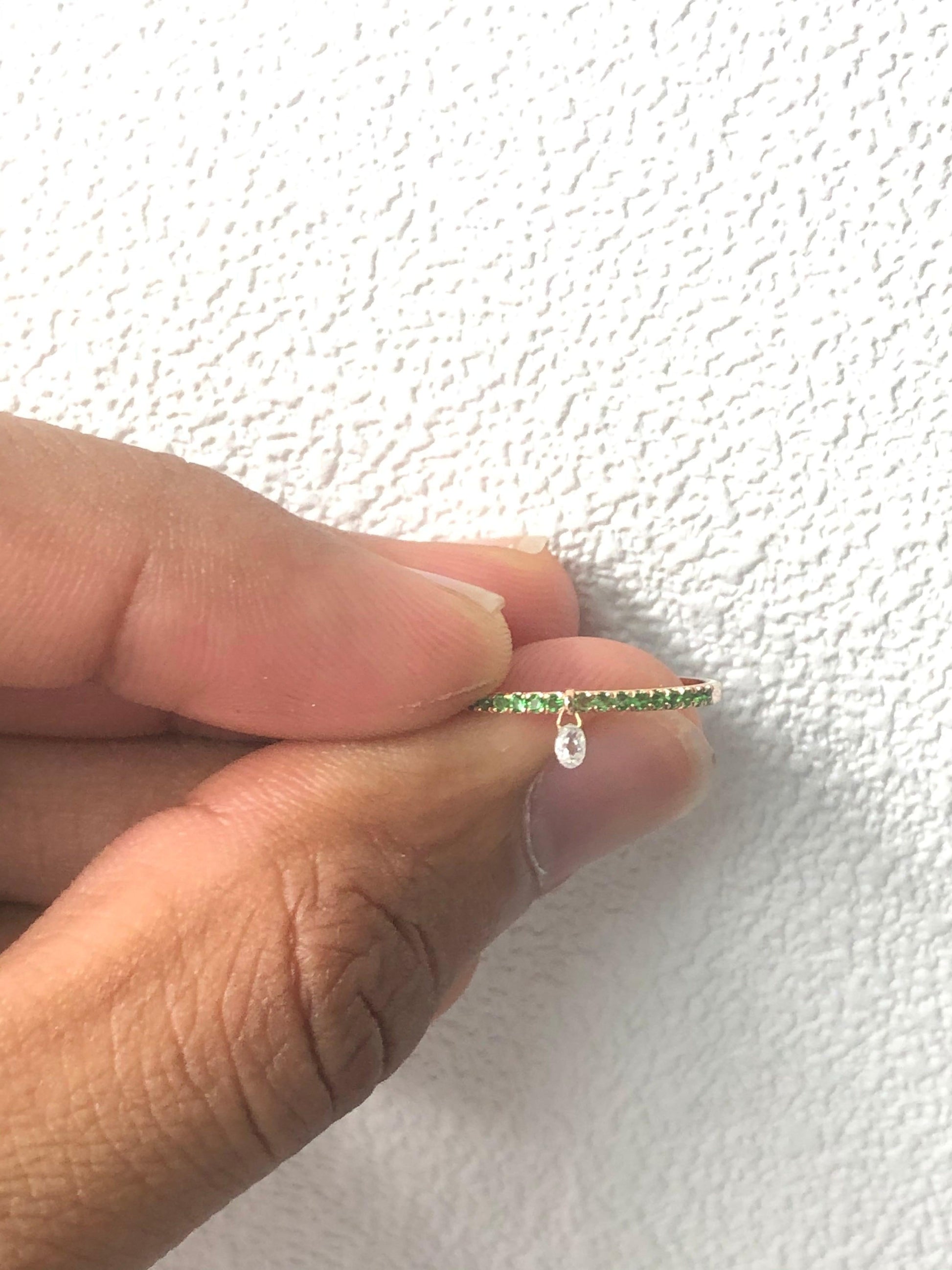 Inspired by the beauty of a rain drop, Our eccentric Dangling diamond ring is an absolute show-stopper. It has 1 pieces Rain Drops White Diamond Briolette's set with Green Emeralds Band
