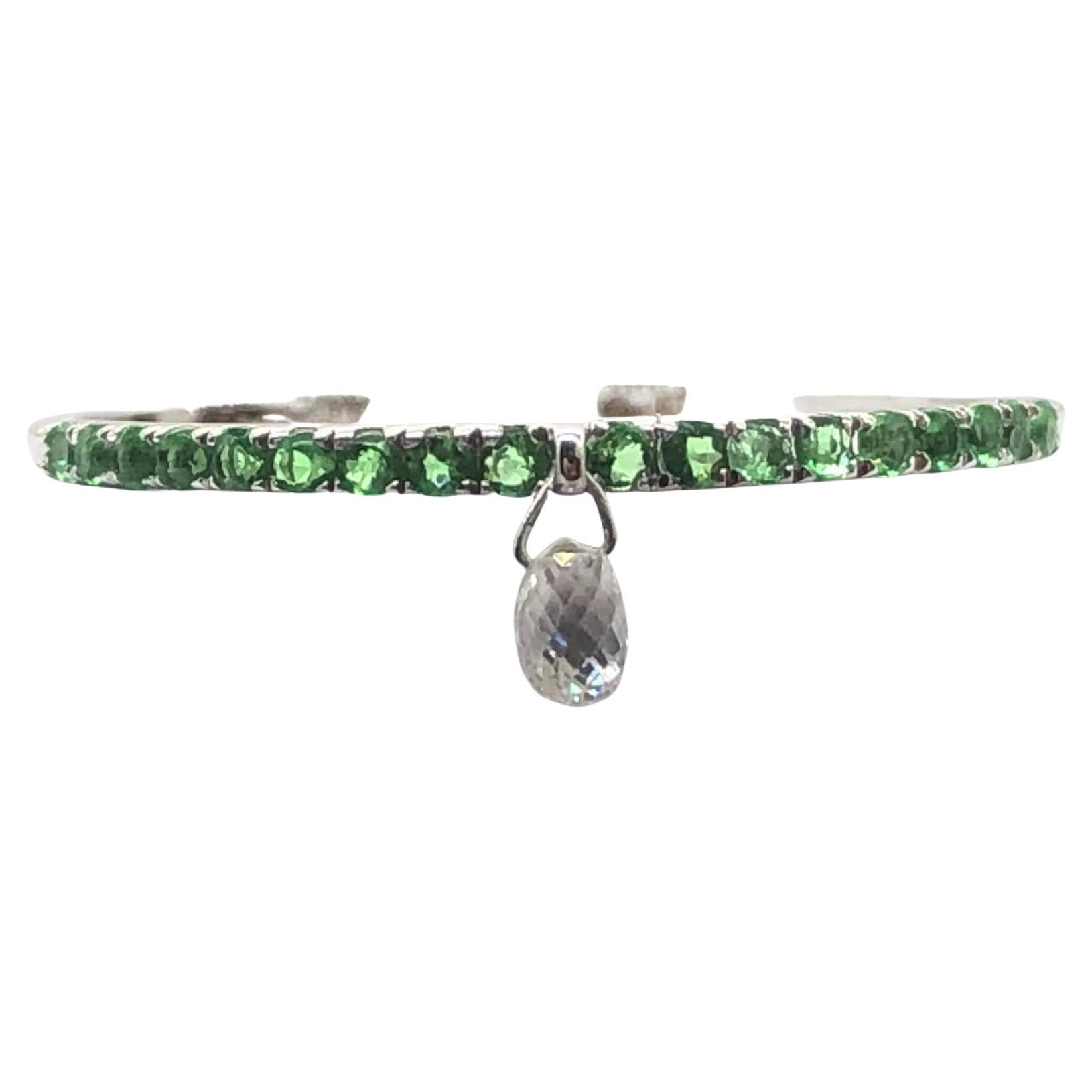 Inspired by the beauty of a rain drop, Our eccentric Dangling diamond ring is an absolute show-stopper. It has 1 pieces Rain Drops White Diamond Briolette's set with Green Emeralds Band