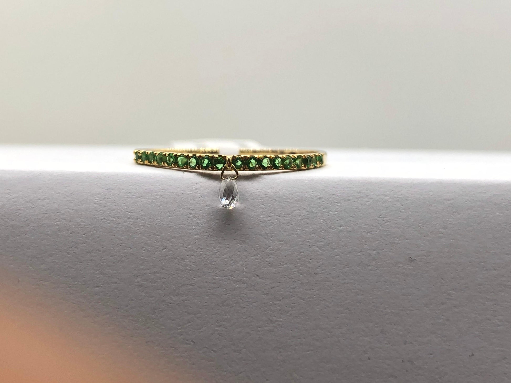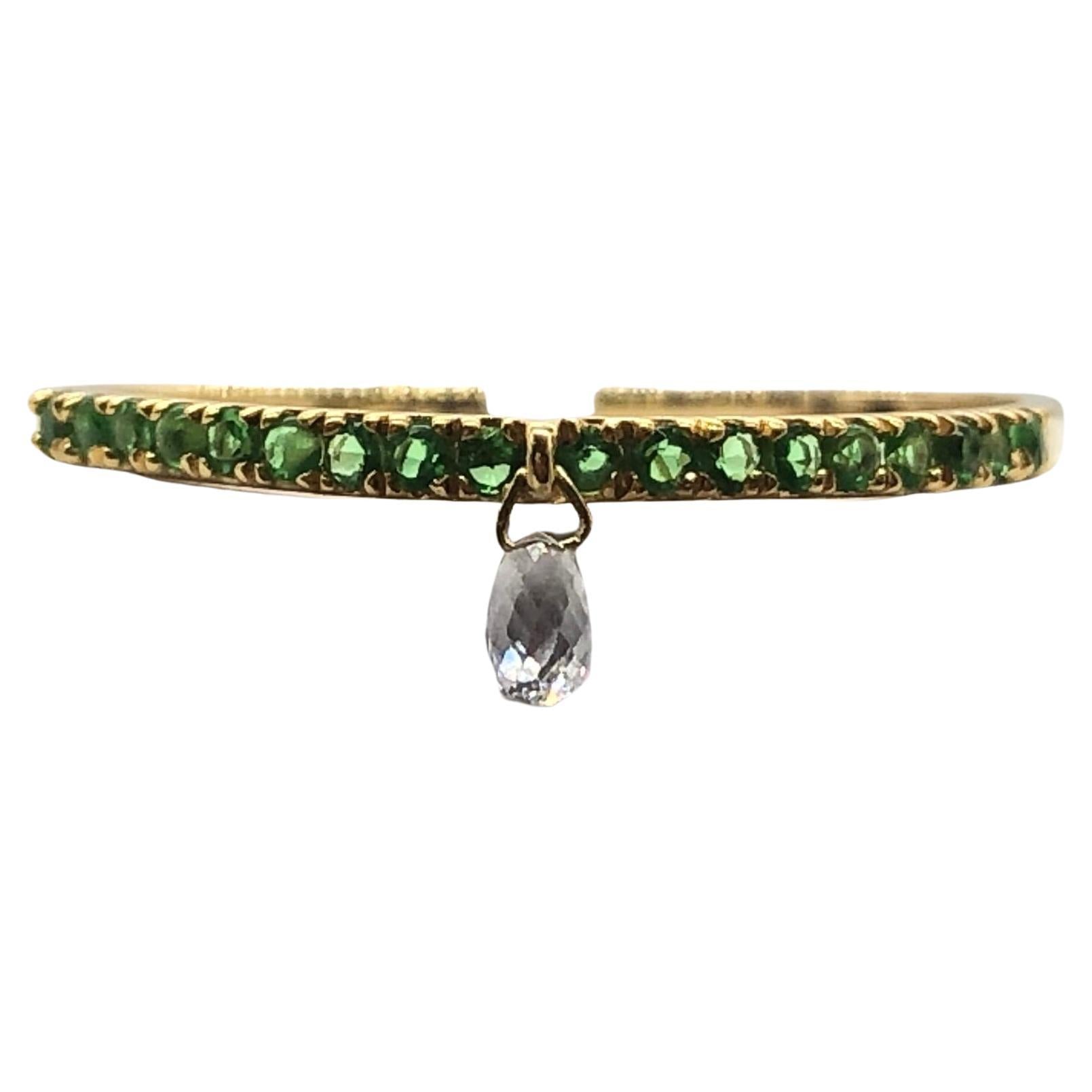 Inspired by the beauty of a rain drop, Our eccentric Dangling diamond ring is an absolute show-stopper. It has 1 pieces Rain Drops White Diamond Briolette's set with Green Emeralds Band