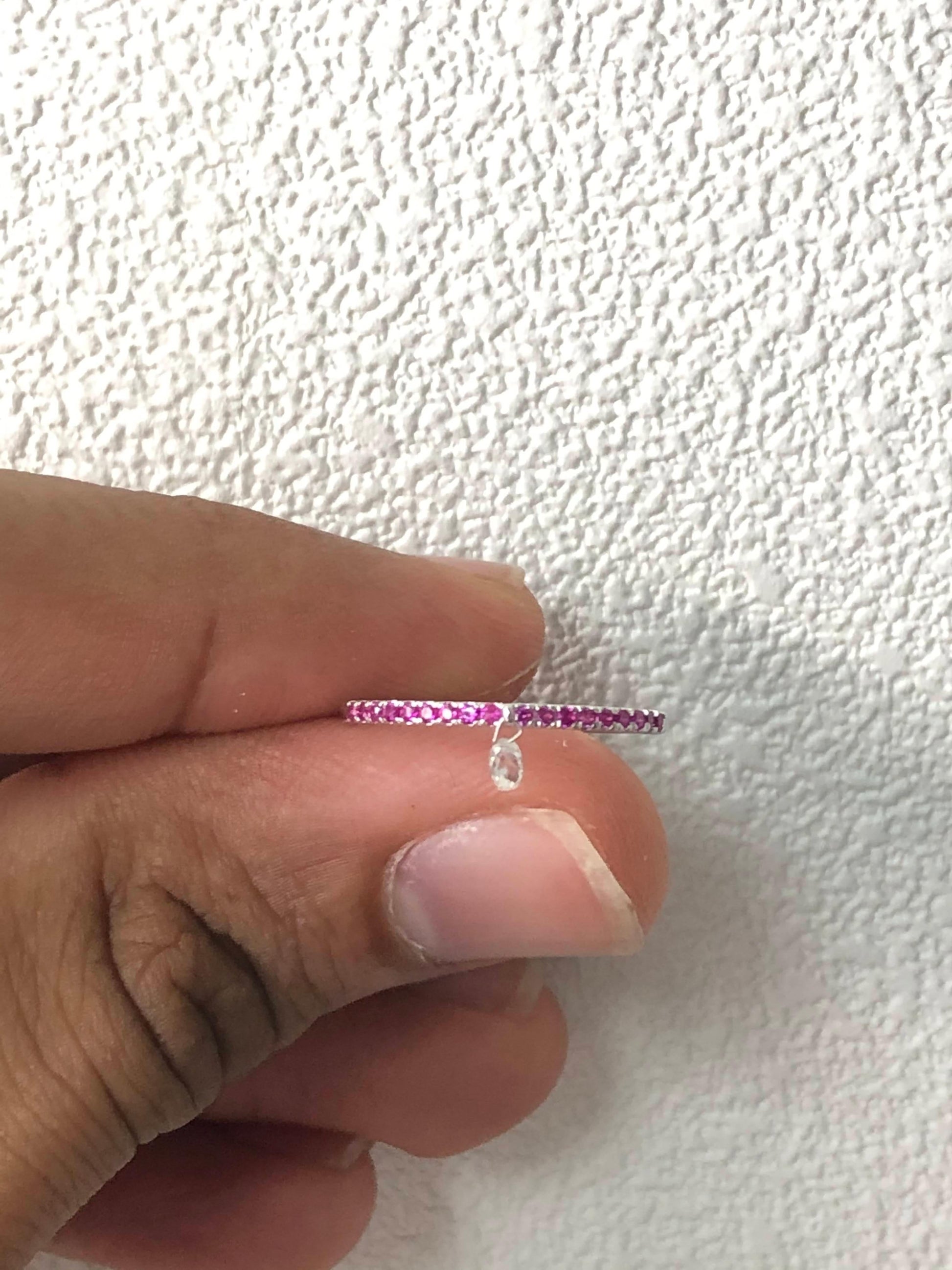 Inspired by the beauty of a rain drop, Our eccentric Dangling diamond ring is an absolute show-stopper. It has 1 pieces Rain Drops White Diamond Briolette's set with Red Ruby Band.