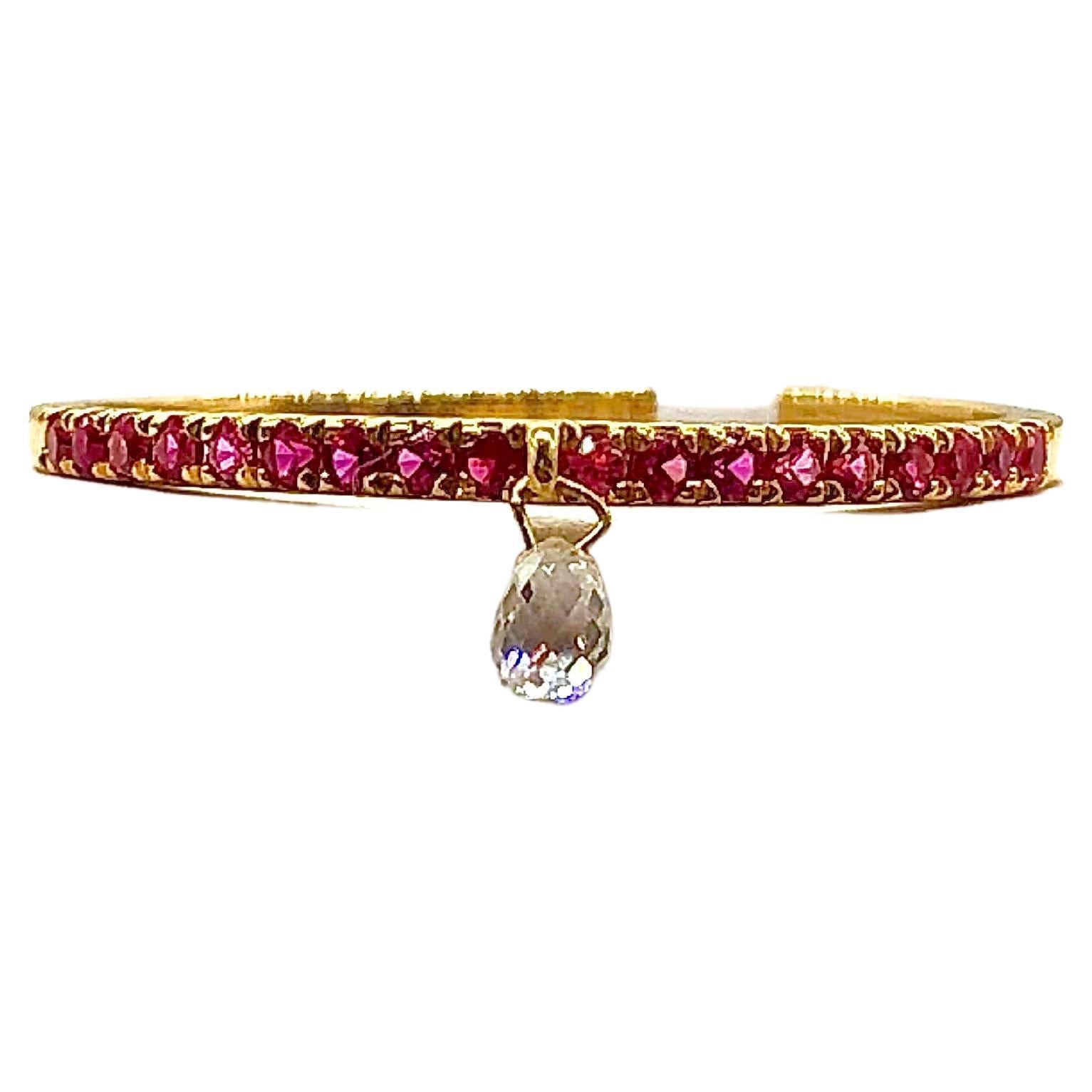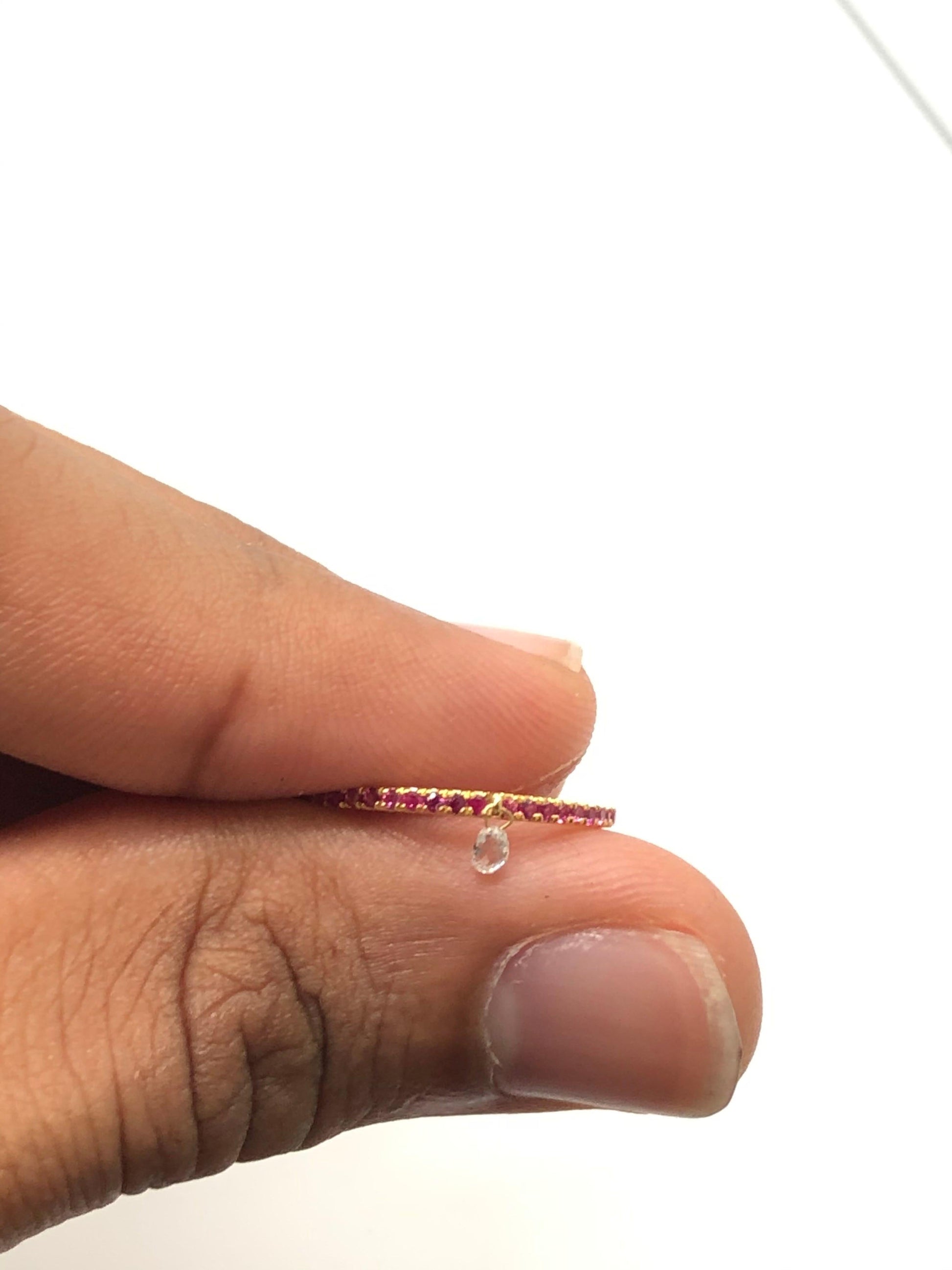 Inspired by the beauty of a rain drop, Our eccentric Dangling diamond ring is an absolute show-stopper. It has 1 pieces Rain Drops White Diamond Briolette's set with Red Ruby Band.
