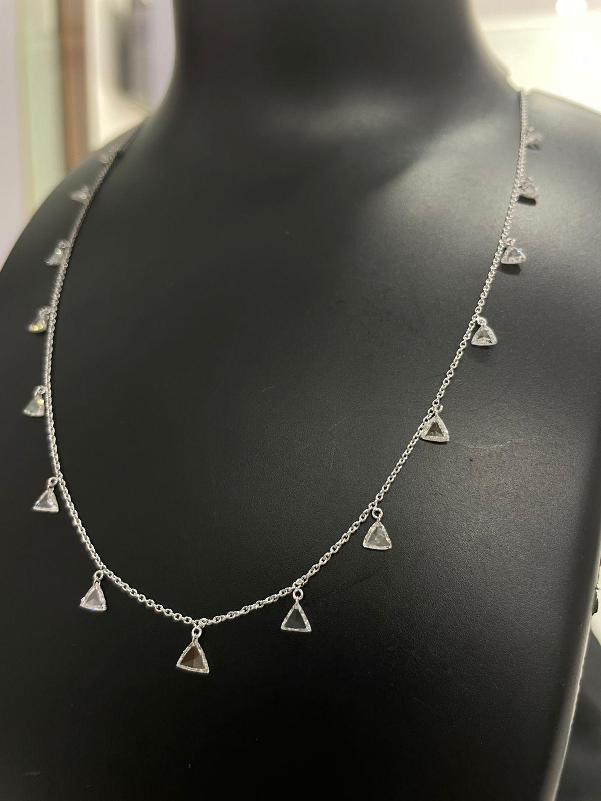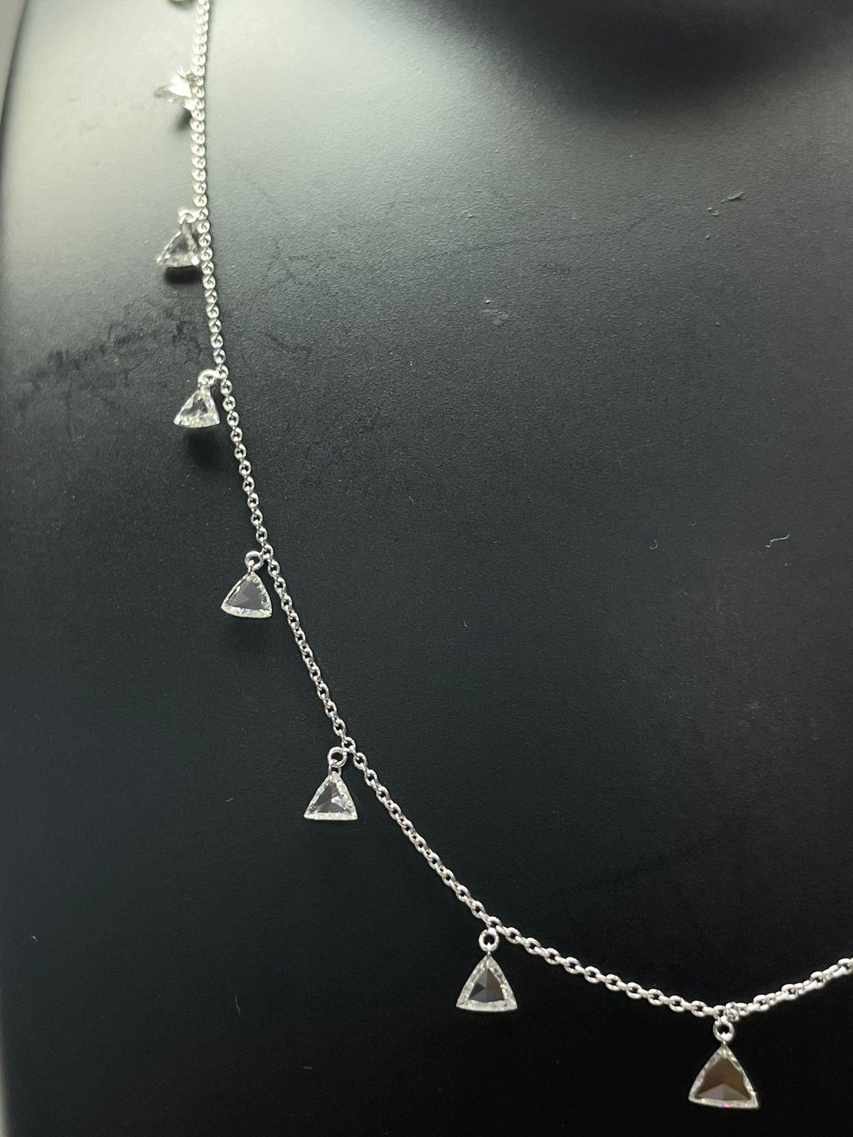 This unique choker necklace is suspended on an 18K fine gold chain by a total of two carats of dangling triangle-shaped diamond rosecuts. This exquisite rosecut necklace gives your outfit a radiant radiance. Individual diamonds are suspended from the chains to create a dynamic, brilliant design that shimmers with movement. This necklace is so pleasant to wear every day or layered over other necklaces.